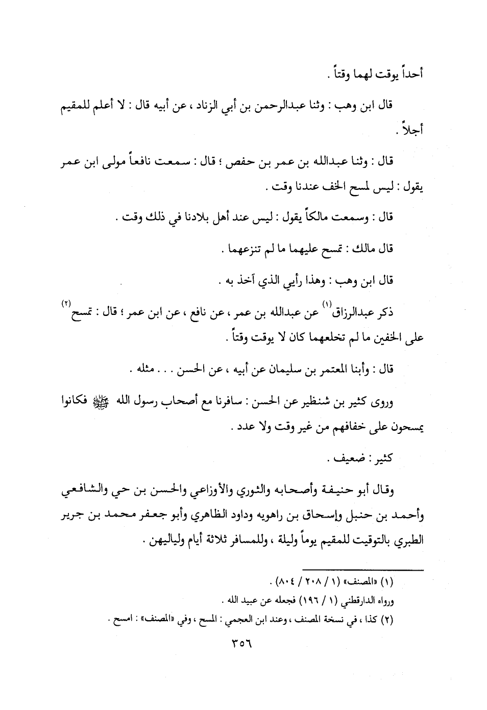 قال: وثنا عبد الله بن عمر بن حفص؛ قال: سمعت نافعًا مولى ابن عمر يقول: ليس لمسح الخف عندنا وقت.