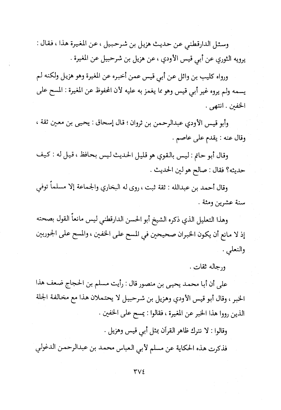 على أن أبا محمد يحيى بن منصور قال: رأيت مسلم بن الحجاج ضعف هذا الخبر، وقال أبو قيس الأودي وهزيل بن شرحبيل لا يحتملان هذا مع مخالفة الجلة الذين رووا هذا الخبر عن المغيرة، فقالوا: يمسح على الخفين.