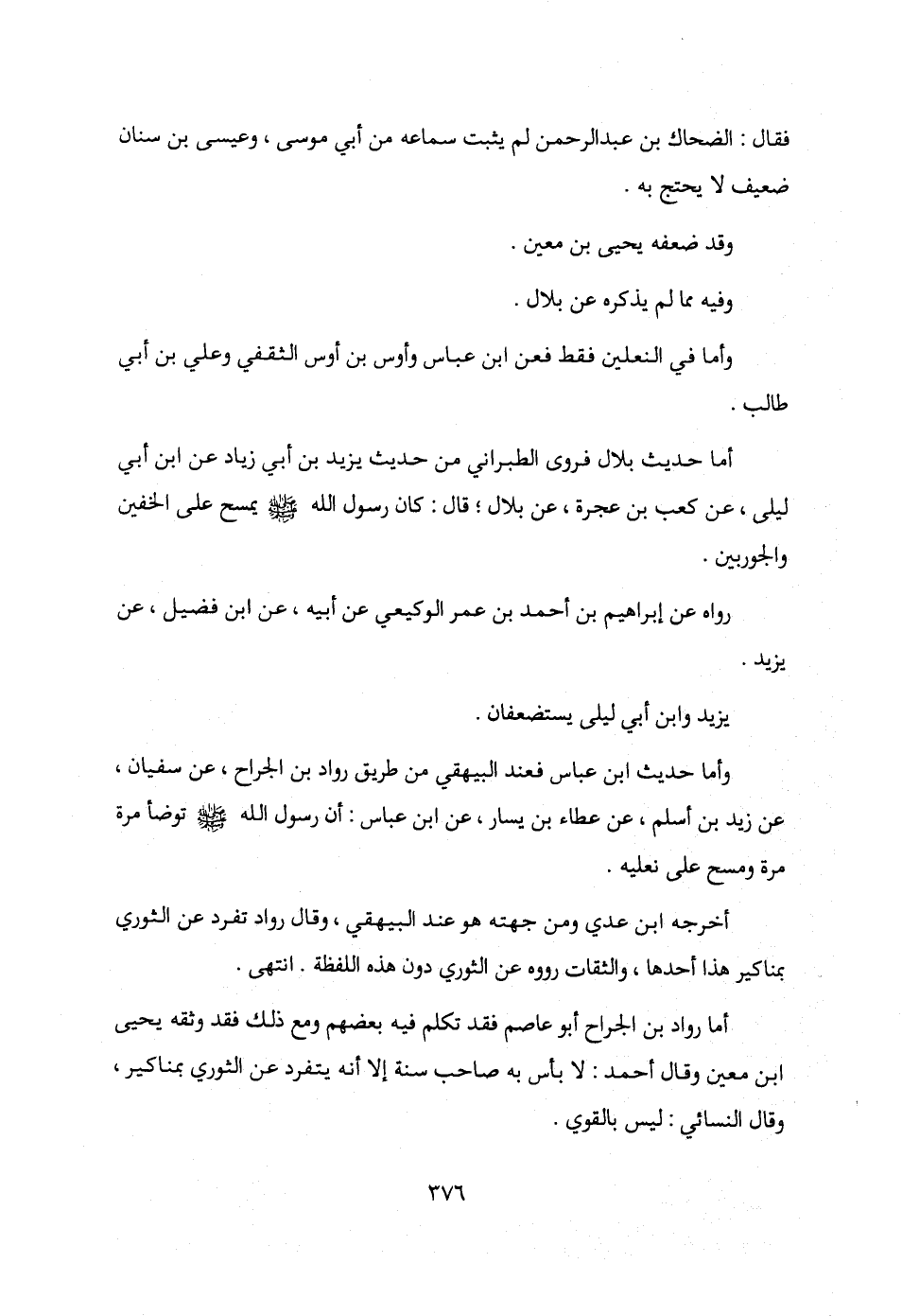 وأما حديث ابن عباس فعند البيهقي من طريق رواد بن الجراح، عن سفيان، عن زيد بن أسلم، عن عطاء بن يسار، عن ابن عباس: أن رسول الله - صلى الله عليه وسلم - توضأ مرة مرة ومسح على نعليه.