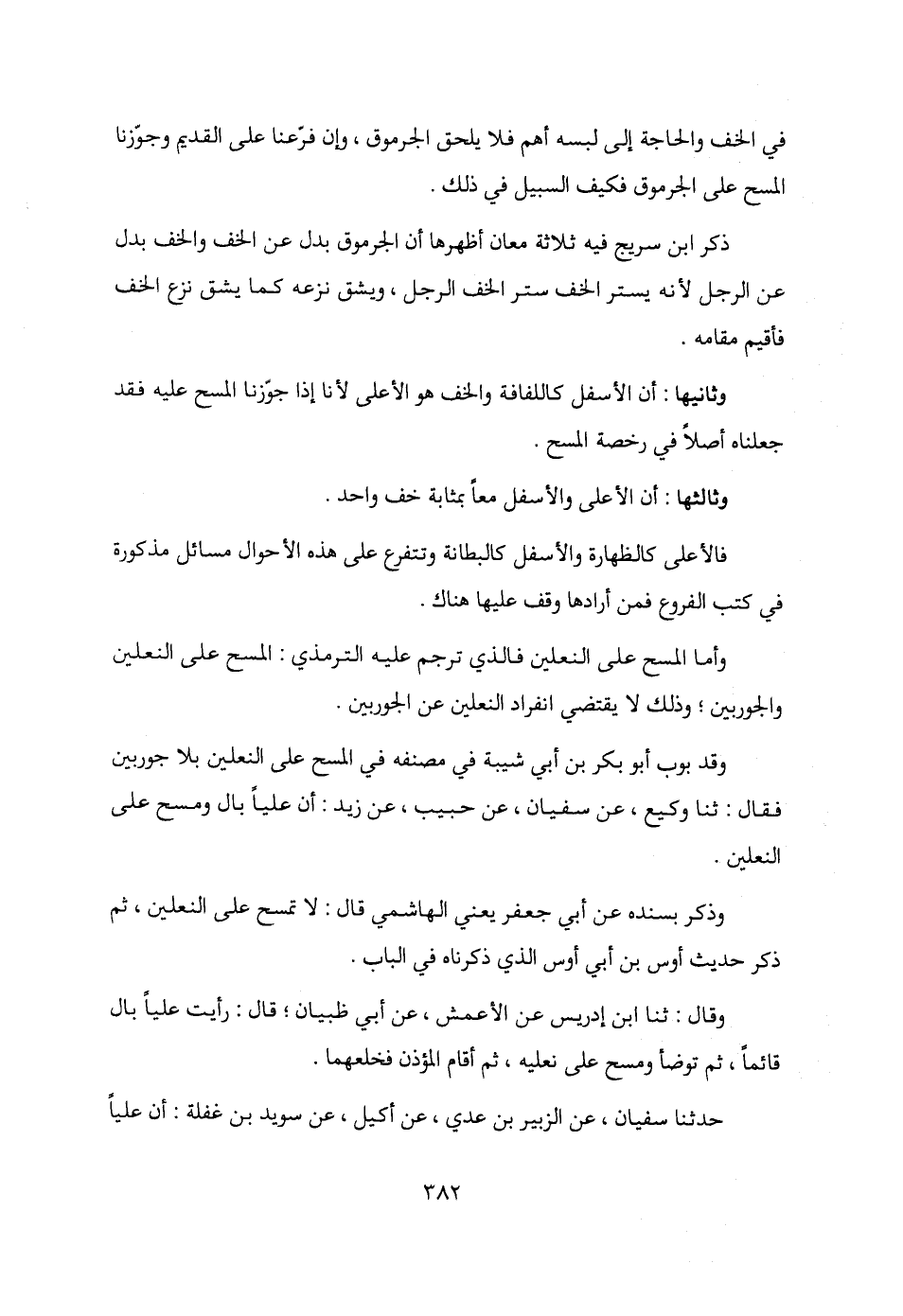 وقد بوب أبو بكر بن أبي شيبة في مصنفه في المسح على النعلين بلا جوربين فقال: ثنا وكيع، عن سفيان، عن حبيب، عن زيد: أن عليًّا بال ومسح على النعلين.