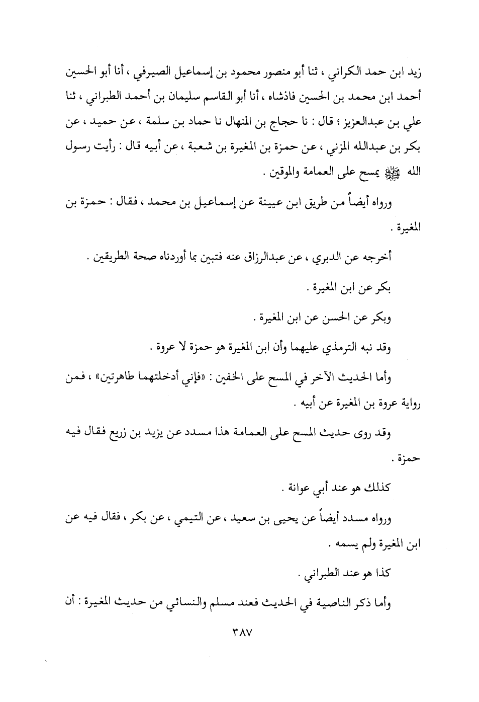 وقد روى حديت المسح على العمامة هذا مسدد عن يزيد بن زريع فقال فيه حمزة.
