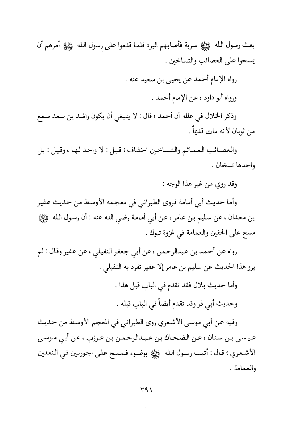 وأما حديث أبي أمامة فروى الطبراني في معجمه الأوسط من حديث عفير بن معدان، عن سليم بن عامر، عن أبي أمامة رضي الله عنه: أن رسول الله - صلى الله عليه وسلم - مسح على الخفين والعمامة في غزوة تبوك.