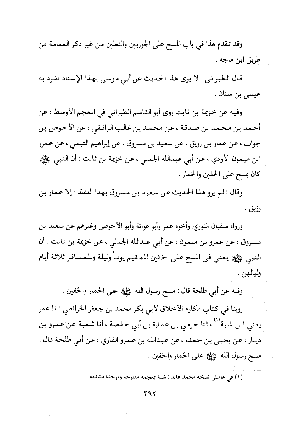 وفيه عن خزيمة بن ثابت روى أبو القاسم الطبراني في المعجم الأوسط، عن أحمد بن محمد بن صدقة، عن محمد بن غالب الرافقي، عن الأحوص بن جواب، عن عمار بن رزيق، عن سعيد بن مسروق، عن إبراهيم التيمي، عن عمرو بن ميمون الأودي، عن أبي عبد الله الجدلي، عن خزيمة بن ثابت: أن النبي - صلى الله عليه وسلم - كان يمسح على الخفين والخمار.