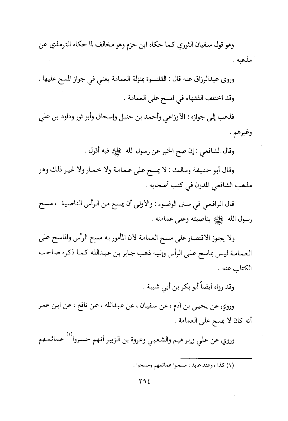 وروي عن يحيى بن آدم، عن سفيان، عن عبد الله، عن نافع، عن ابن عمر أنه كان لا يمسح على العمامة.