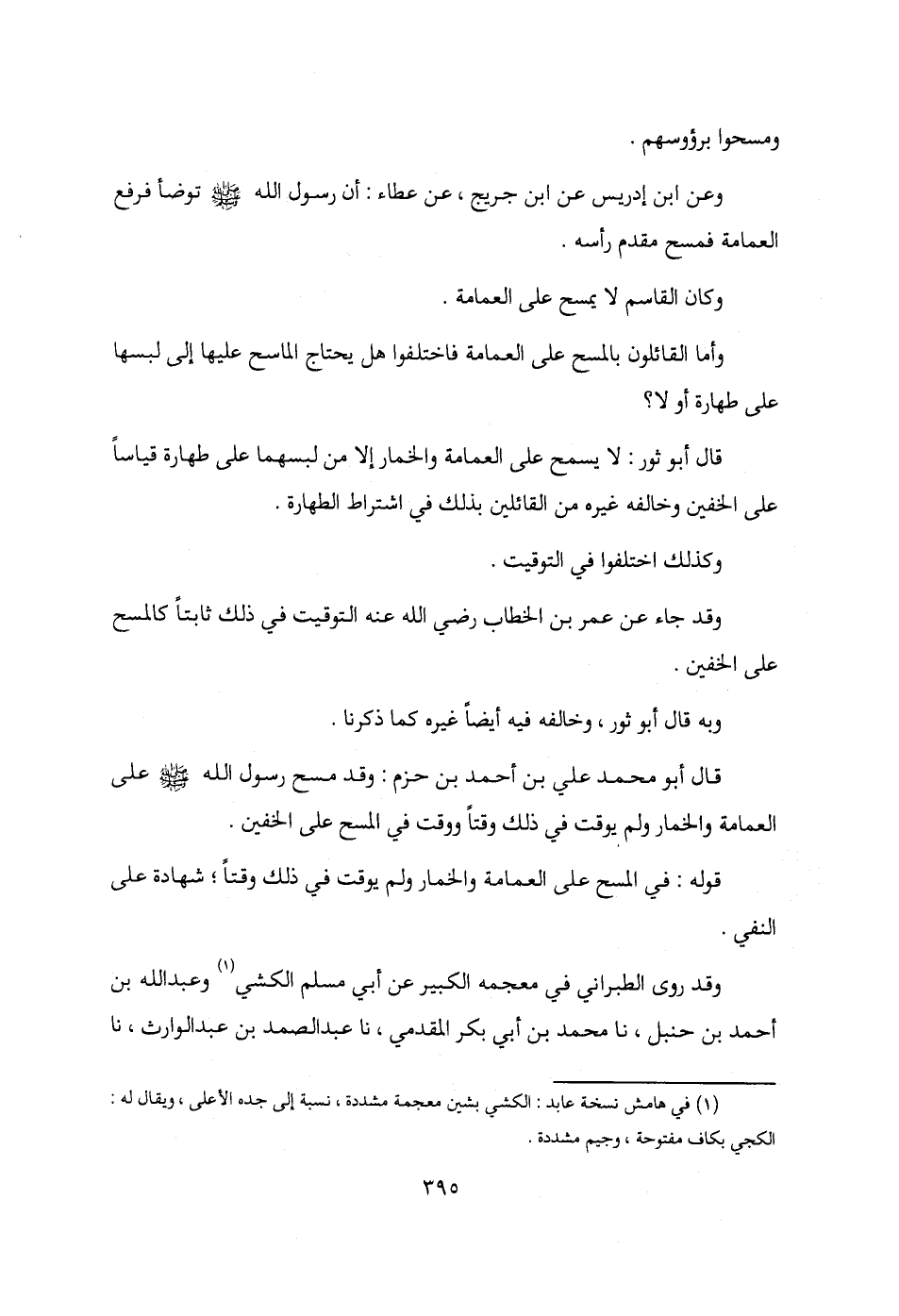 وعن ابن إدريس عن ابن جريج، عن عطاء: أن رسول الله - صلى الله عليه وسلم - توضأ فرفع العمامة فمسح مقدم رأسه.