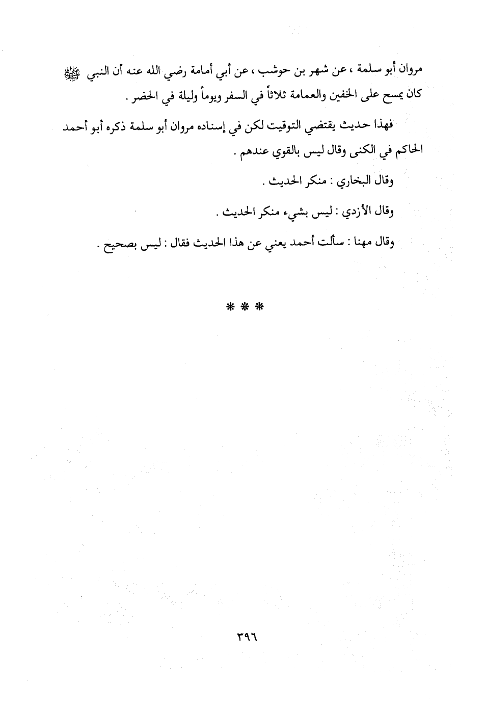 مروان أبو سلمة، عن شهر بن حوشب، عن أبي أمامة رضي الله عنه أن النبي - صلى الله عليه وسلم - كان يمسح على الخفين والعمامة ثلاثًا في السفر ويومًا وليلة في الحضر.