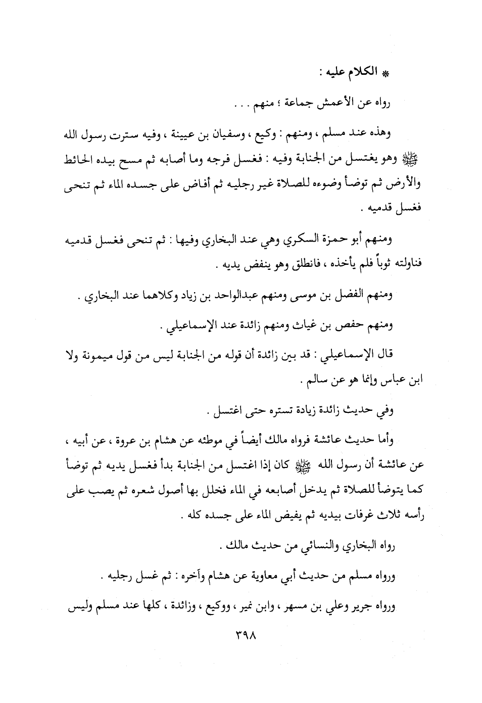 وهذه عند مسلم، ومنهم: وكيع، وسفيان بن عيينة، وفيه سترت رسول الله - صلى الله عليه وسلم - وهو يغتسل من الجنابة وفيه: فغسل فرجه وما أصابه ثم مسح بيده الحائط والأرض ثم توضأ وضوءه للصلاة غير رجليه ثم أفاض على جسده الماء ثم تنحى فغسل قدميه.