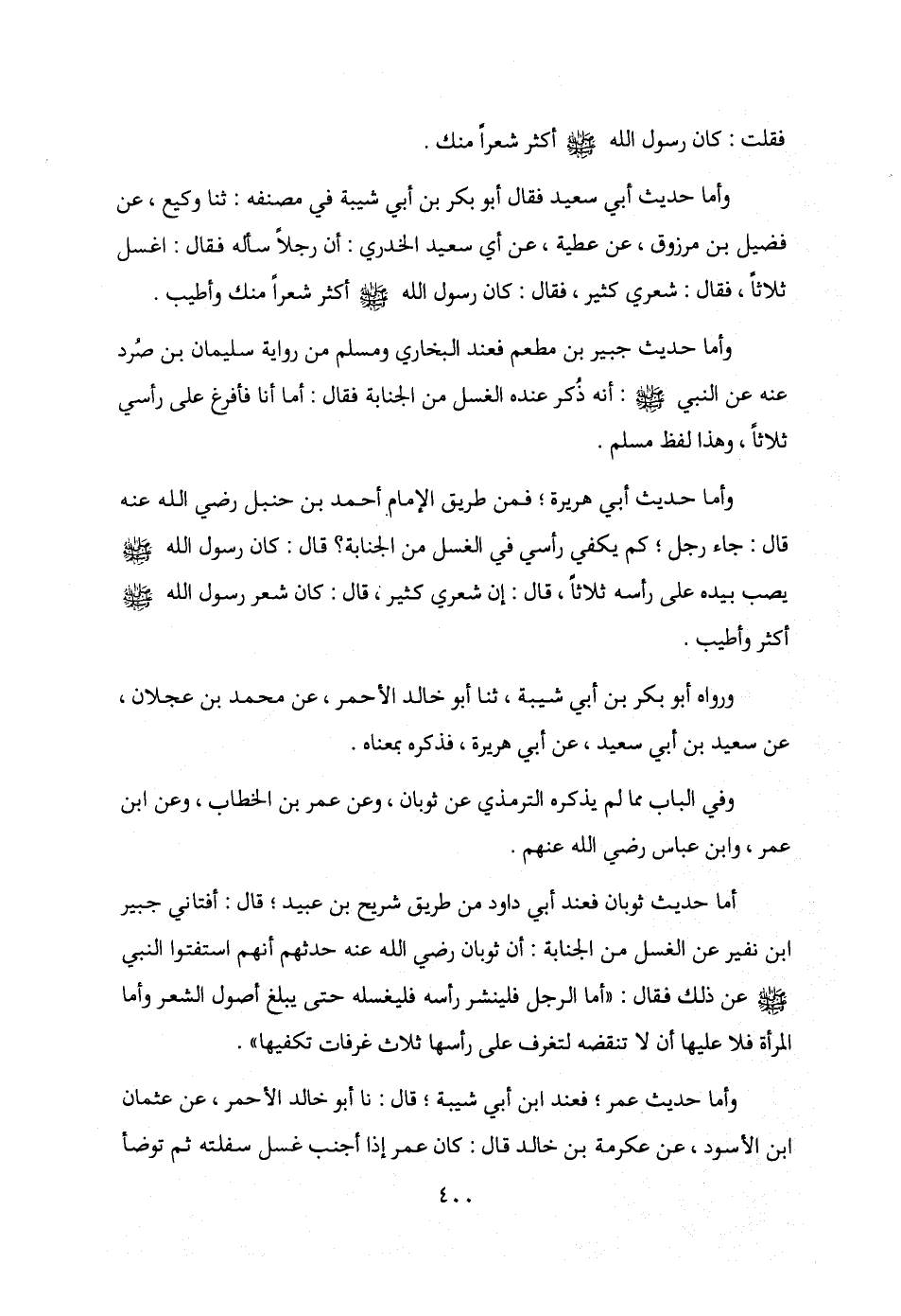 وأما حديث أبي سعيد فقال أبو بكر بن أبي شيبة في مصنفه: ثنا وكيع، عن فضيل بن مرزوق، عن عطية، عن أبي سعيد الخدري: أن رجلًا سأله فقال: اغسل ثلاثًا، فقال: شعري كثير، فقال: كان رسول الله - صلى الله عليه وسلم - أكثر شعرًا منك وأطيب.