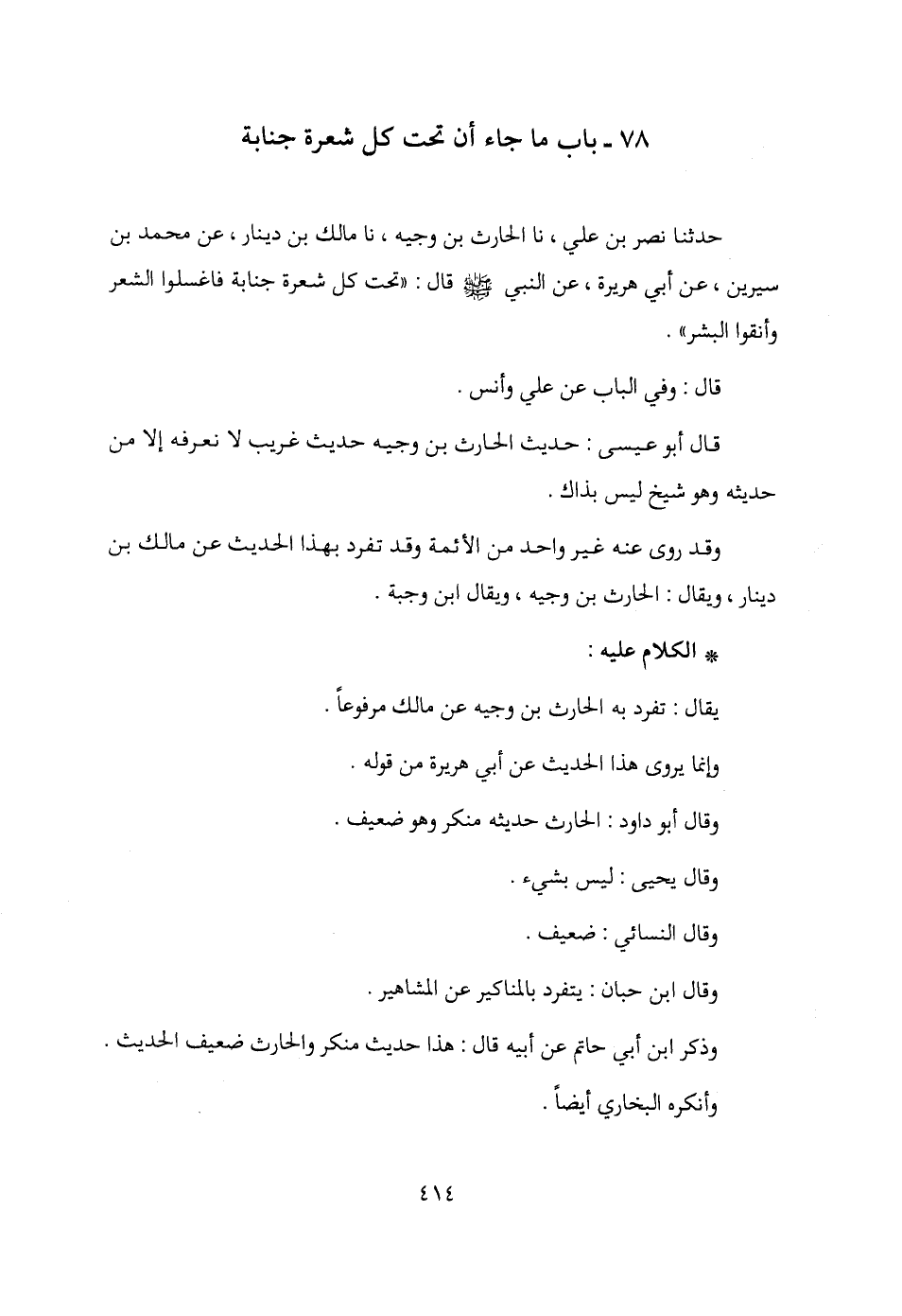 حدثنا نصر بن علي، نا الحارث بن وجيه، نا مالك بن دينار، عن محمد بن سيرين، عن أبي هريرة، عن النبي - صلى الله عليه وسلم - قال: "تحت كل شعرة جنابة فاغسلوا الشعر وأنقوا البشر".