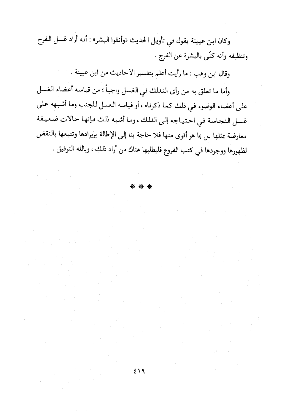 وكان ابن عيينة يقول في تأويل الحديث "وأنقوا البشر": أنَّه أراد غسل الفرج وتنظيفه وأنه كنّى بالبشرة عن الفرج.