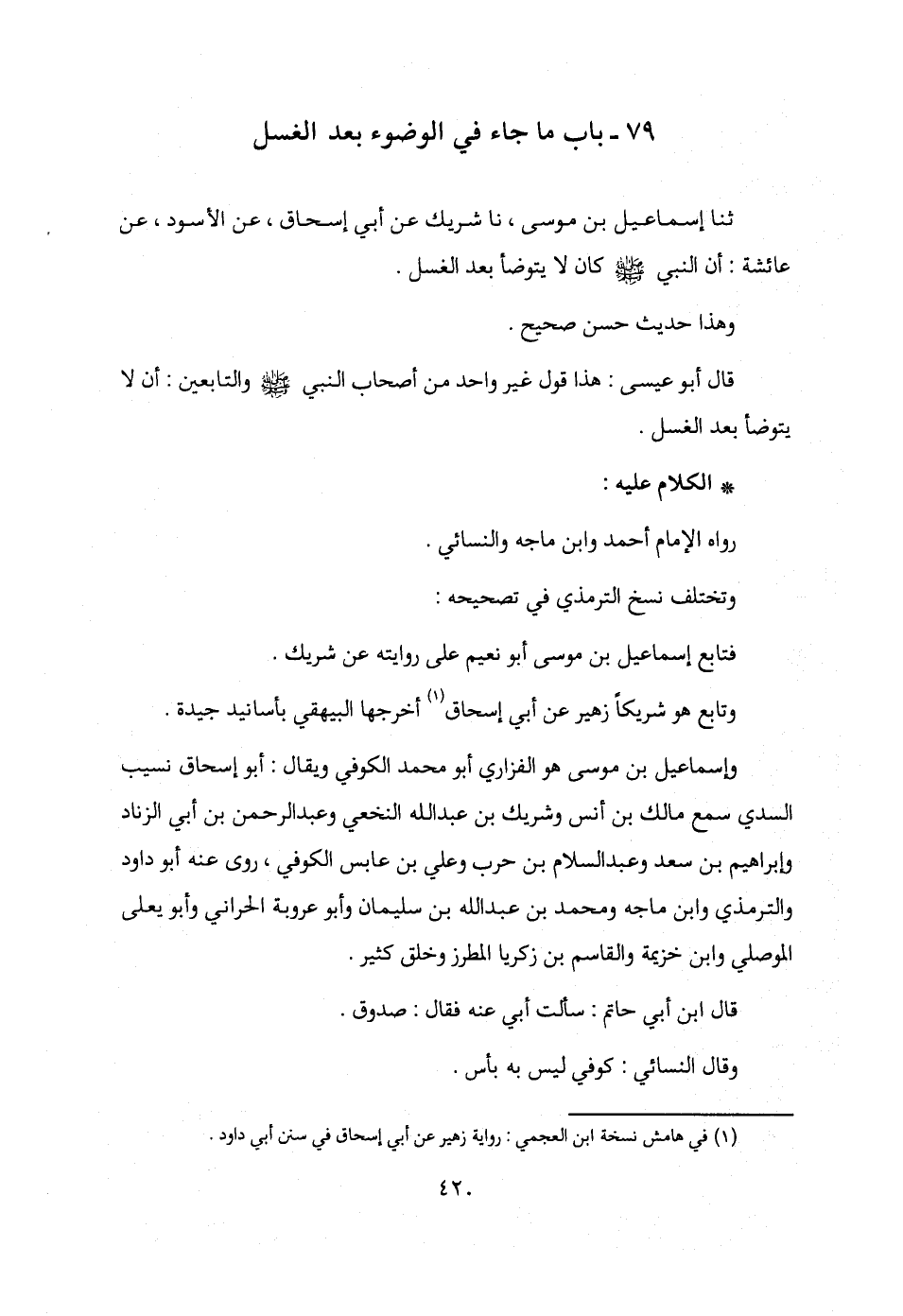 ثنا إسماعيل بن موسى، نا شريك عن أبي إسحاق، عن الأسود، عن عائشة: أن النبي - صلى الله عليه وسلم - كان لا يتوضأ بعد الغسل.