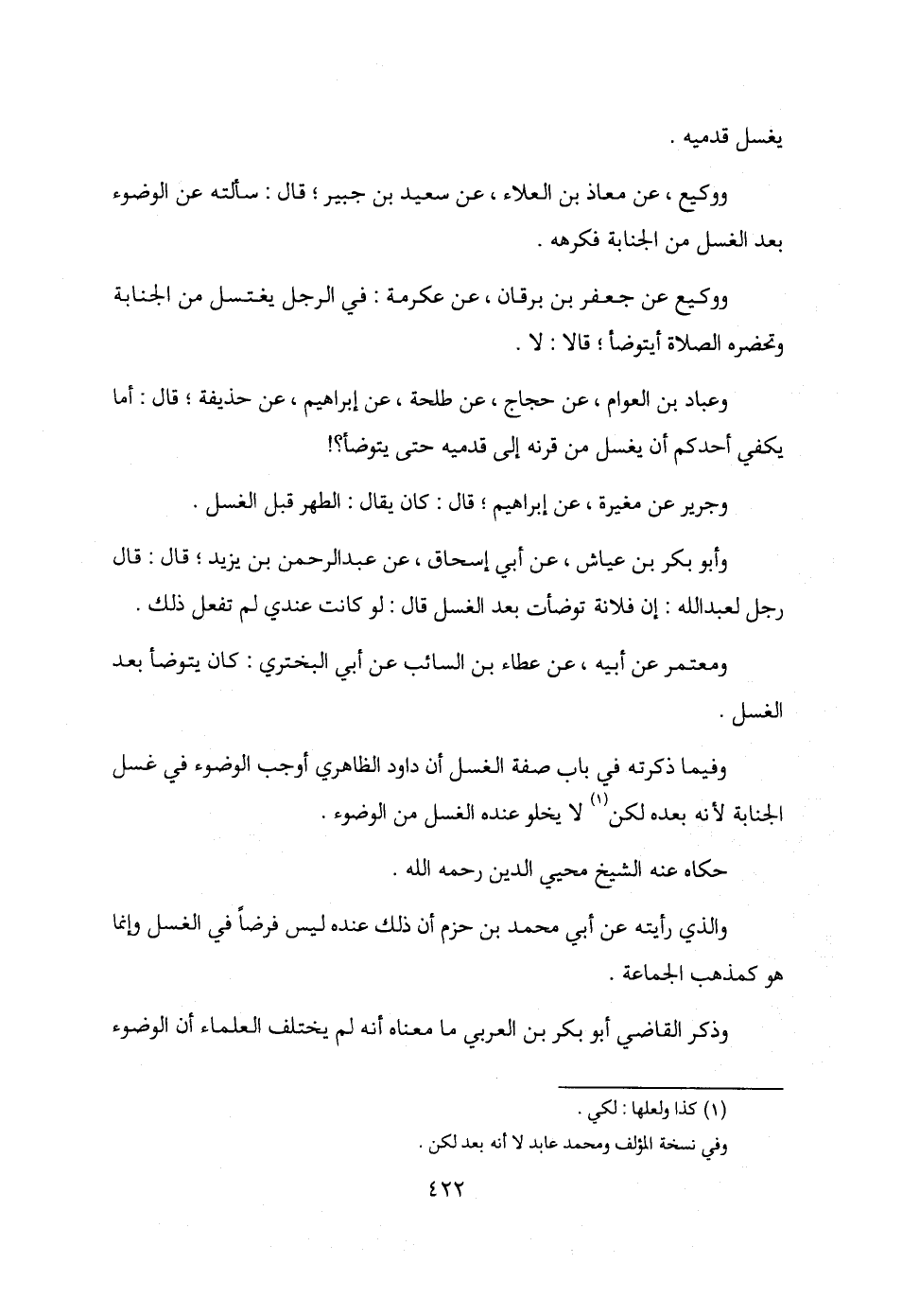 وأبو بكر بن عياش، عن أبي إسحاق، عن عبد الرحمن بن يزيد؛ قال: قال رجل لعبد الله: إن فلانة توضأت بعد الغسل قال: لو كانت عندي لم تفعل ذلك.