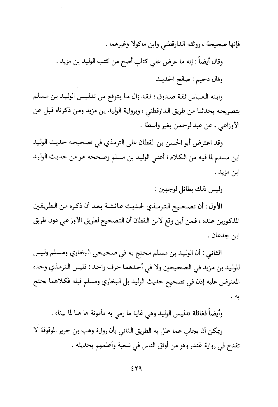 الثاني: أن الوليد بن مسلم محتج به في صحيحي البخاري ومسلم وليس للوليد بن مزيد في الصحيحين ولا في أحدهما حرف واحد؛ فليس الترمذي وحده المعترض عليه إذن في تصحيح حديث الوليد بل البخاري ومسلم قبله فكلاهما يحتج به.