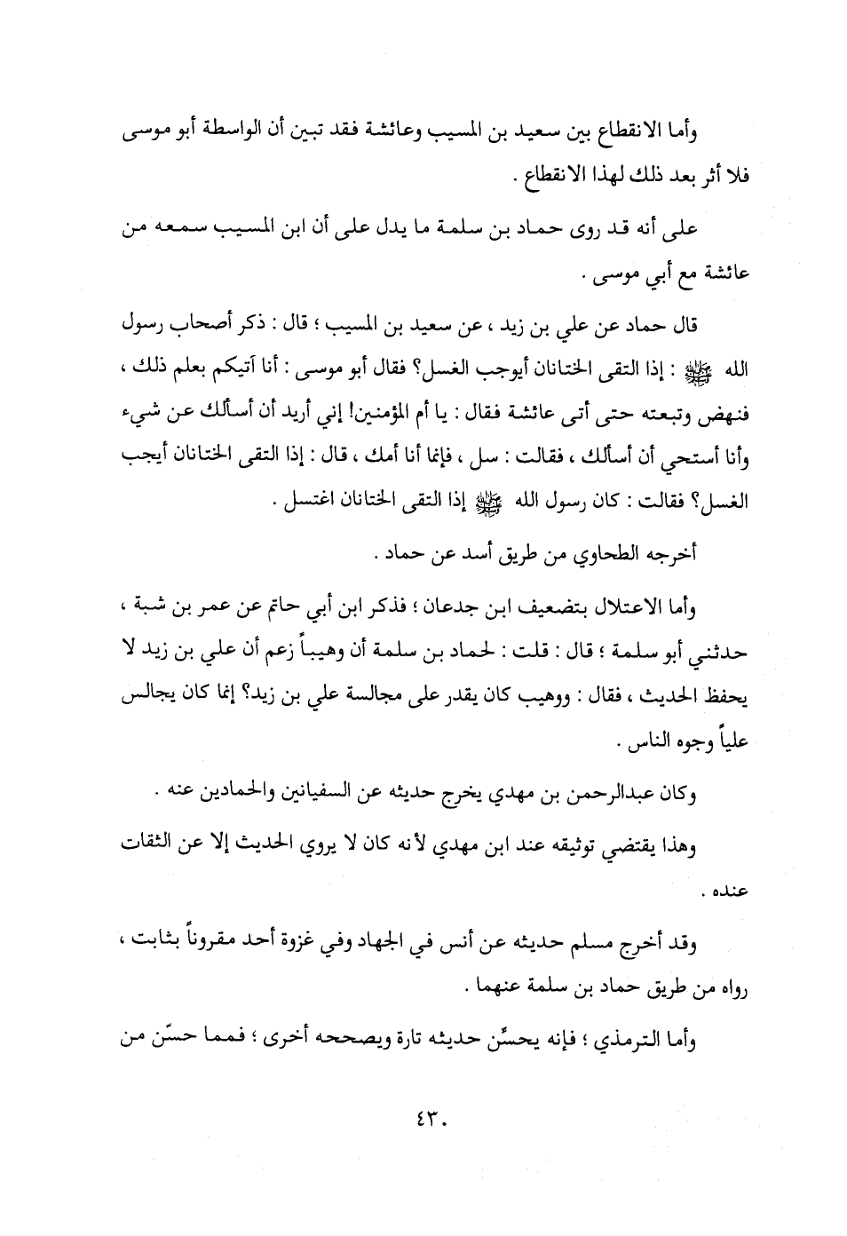 قال حماد عن علي بن زيد، عن سعيد بن المسيب؛ قال: ذكر أصحاب رسول الله - صلى الله عليه وسلم -: إذا التقى الختانان أيوجب الغسل؟ فقال أبو موسى: أنا آتيكم بعلم ذلك، فنهض وتبعته حتَّى أتى عائشة فقال: يا أم المؤمنين! إني أريد أن أسألك عن شيء وأنا أستحي أن أسألك، فقالت: سل، فإنما أنا أمك، قال؛ إذا التقى الختانان أيجب الغسل؟ فقالت: كان رسول الله - صلى الله عليه وسلم - إذا التقى الختانان اغتسل.
