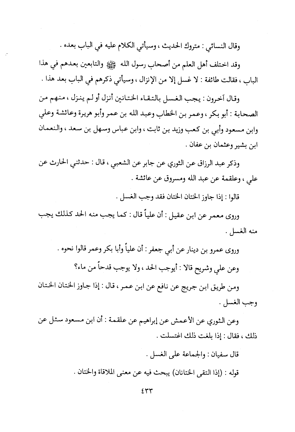 وعن الثوري عن الأعمش عن إبراهيم عن علقمة: أن ابن مسعود سئل عن ذلك، فقال: إذا بلغت ذلك اغتسلت.