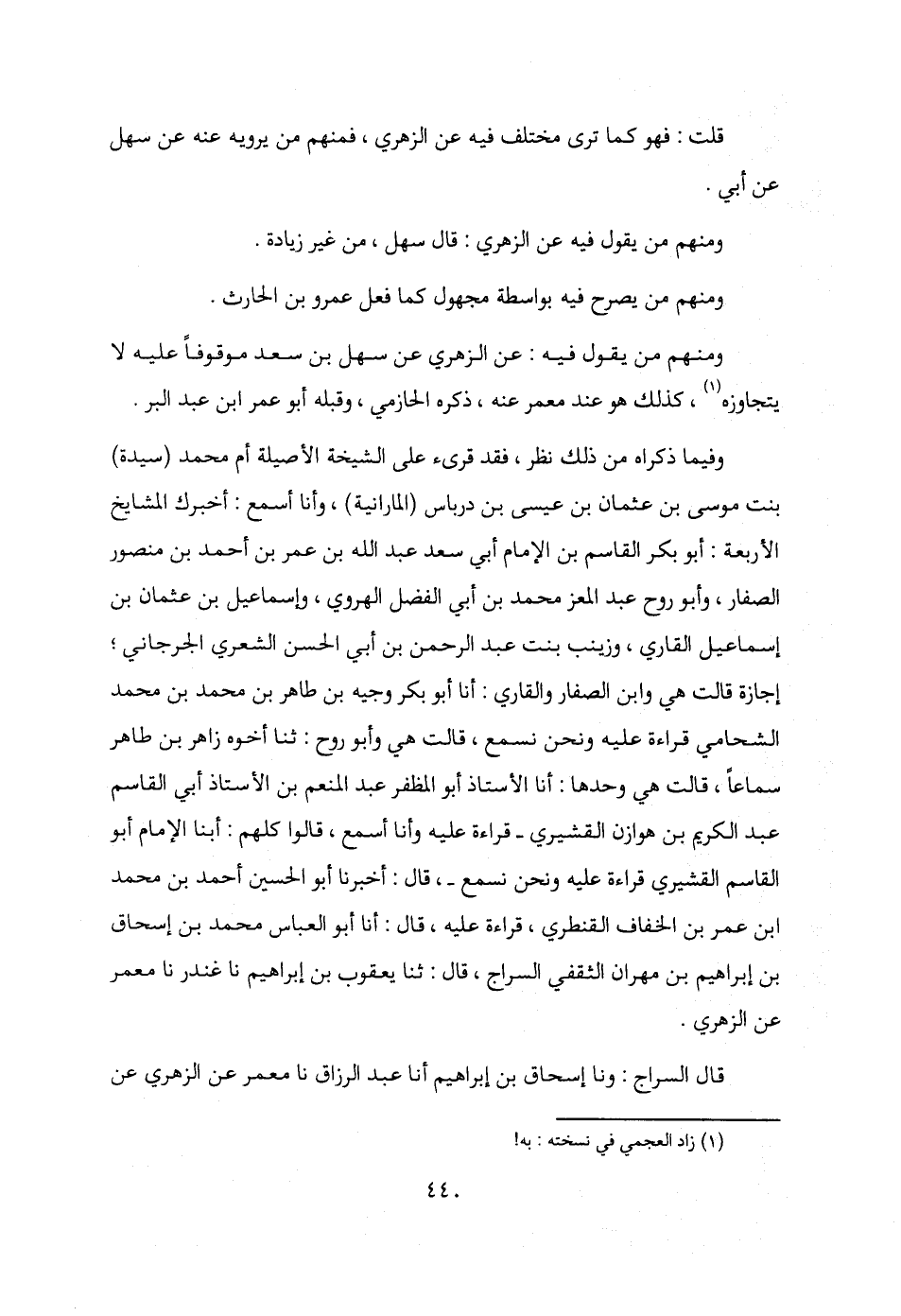 وفيما ذكراه من ذلك نظر، فقد قرئ على الشيخة الأصيلة أم محمد (سيدة) بنت موسى بن عثمان بن عيسى بن درباس (المارانية)، وأنا أسمع: أخبرك الشايخ الأربعة: أبو بكر القاسم بن الإمام أبي سعد عبد الله بن عمر بن أحمد بن منصور الصفار، وأبو روح عبد المعز محمد بن أبي الفضل الهروي، وإسماعيل بن عثمان بن إسماعيل القاري، وزينب بنت عبد الرحمن بن أبي الحسن الشعري الجرجاني؛ إجازة قالت هي وابن الصفار والقاري: أنا أبو بكر وجيه بن طاهر بن محمد بن محمد الشحامي قراءة عليه ونحن نسمع، قالت هي وأبو روح: ثنا أخوه زاهر بن طاهر سماعًا، قالت هي وحدها: أنا الأستاذ أبو المظفر عبد المنعم بن الأستاذ أبي القاسم عبد الكريم بن هوازن القشيري -قراءة عليه وأنا أسمع، قالوا كلهم: أبنا الإمام أبو القاسم القشيري قراءة عليه ونحن نسمع-، قال: أخبرنا أبو الحسين أحمد بن محمد بن عمر بن الخفاف القنطري، قراءة عليه، قال: أنا أبو العباس محمد بن إسحاق بن إبراهيم بن مهران الثقفي السراج، قال: ثنا يعقوب بن إبراهيم نا غندر نا معمر عن الزهري.