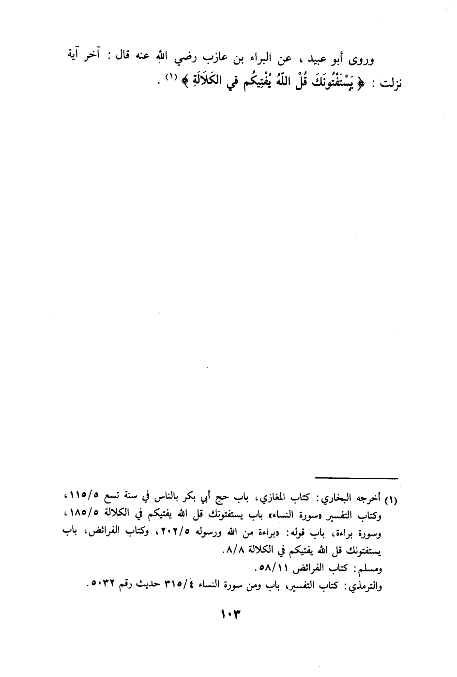 وروى أبو عبيد، عن البراء بن عازب - رضي الله عنه - قال: آخر آية