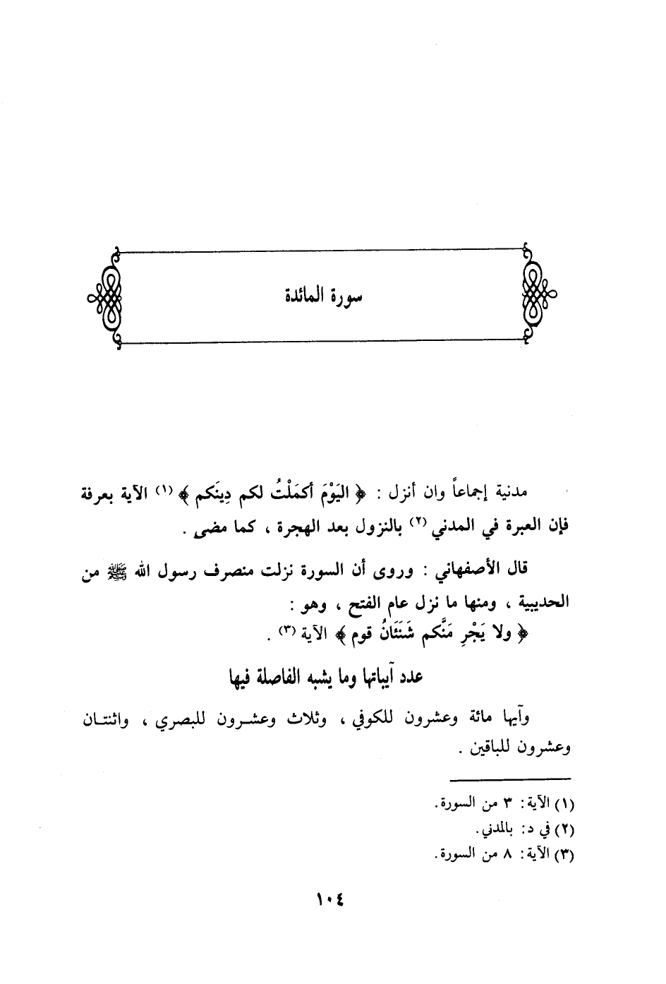 مدنية إجماعاً وان أنزل: (الْيَوْمَ أَكْمَلْتُ لَكُمْ دِينَكُمْ) الآية بعرفة