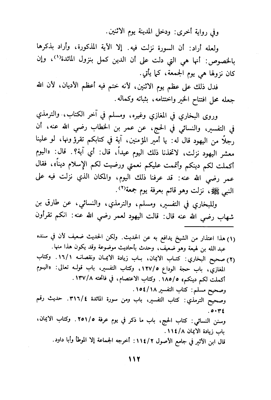 معشر اليهود نزلت، لاتخذنا ذلك اليوم عيداً، قال: أي آية؟. قال: (الْيَوْمَ أَكْمَلْتُ لَكُمْ دِينَكُمْ وَأَتْمَمْتُ عَلَيْكُمْ نِعْمَتِي وَرَضِيتُ لَكُمُ الْإِسْلَامَ دِينًا) .
