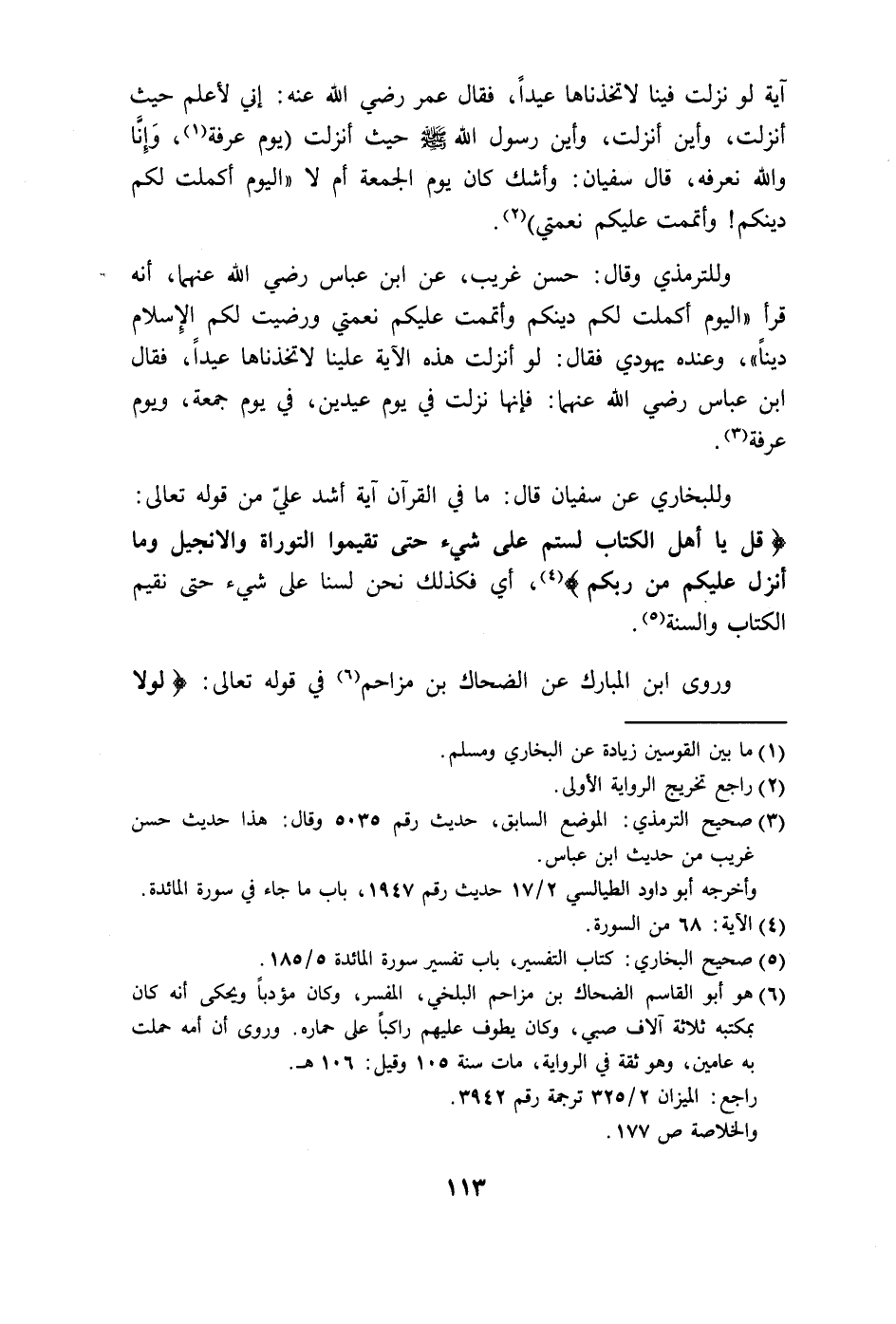 أنزلت، وأين أنزلت، وأين رسول الله - صلى الله عليه وسلم - حيث أنزلت (يوم عرفة، وَإِنًا والله نعرفه، قال سفيان: وأشك كان يوم الجمعة أم لا "الْيَوْمَ أَكْمَلْتُ لَكُمْ دِينَكُمْ وَأَتْمَمْتُ عَلَيْكُمْ نِعْمَتِي) .
