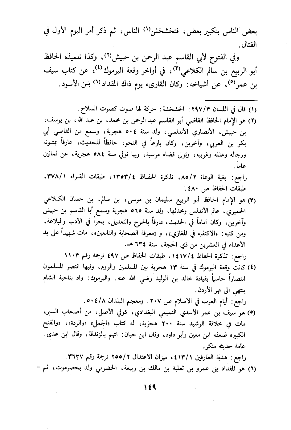 وفي الفتوح لأبي القاسم عبد الرحمن بن حبيش، وكذا تلميذه الحافظ