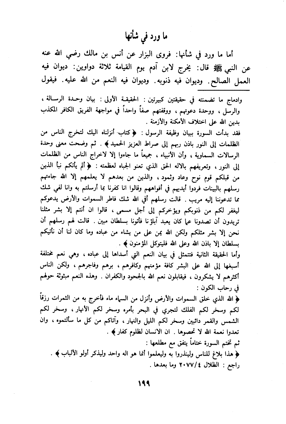 عن النبي - صلى الله عليه وسلم - قال: يخرج لابن آدم يوم القيامة ثلاثة دواوين: ديوان فيه العمل الصالح. وديوان فيه ذنوبه. وديوان فيه النعم من الله عليه. فيقول
