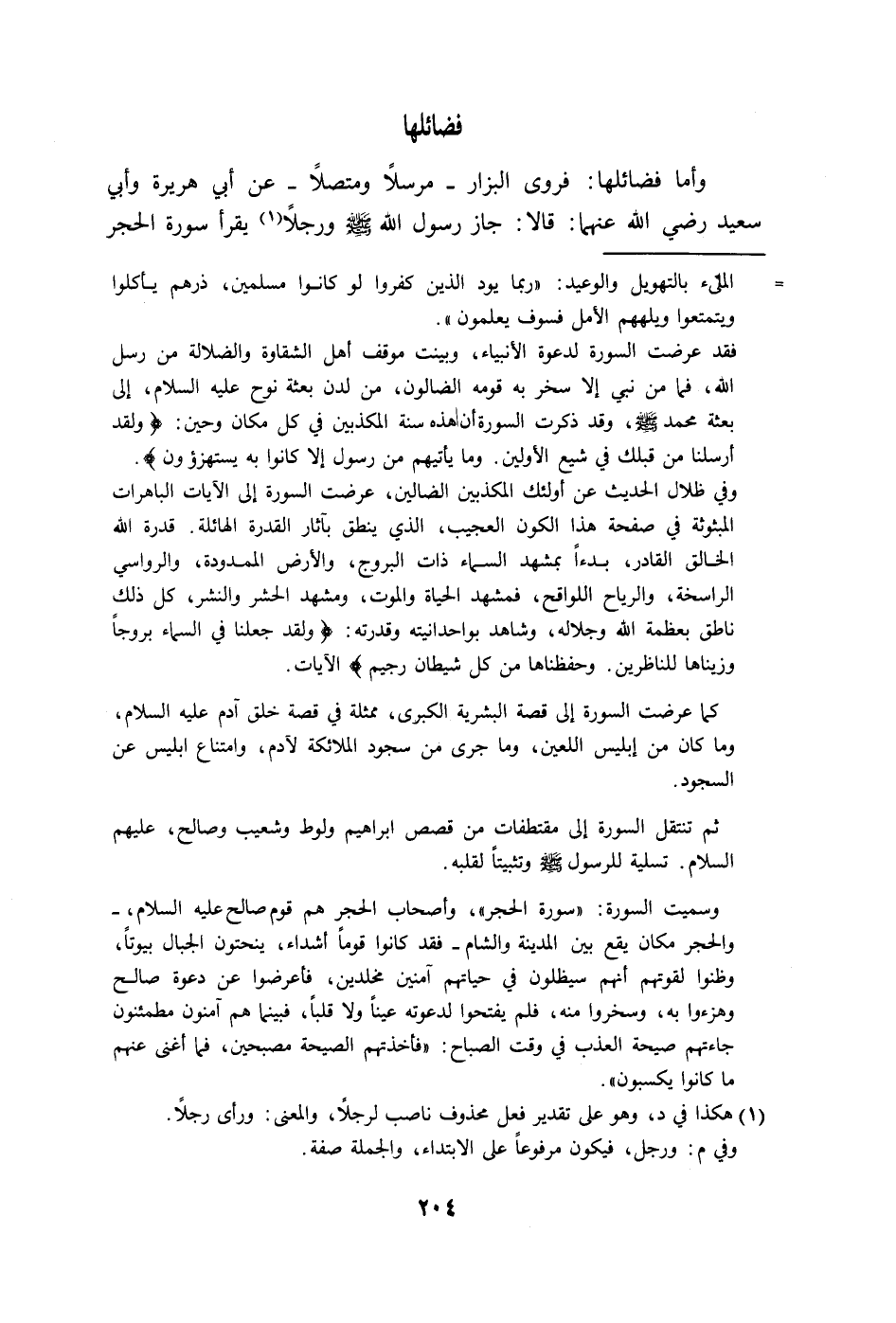 سعيد رضي الله عنهما: قالا: جاز رسول الله - صلى الله عليه وسلم - ورجلاً يقرأ سورة الحجر