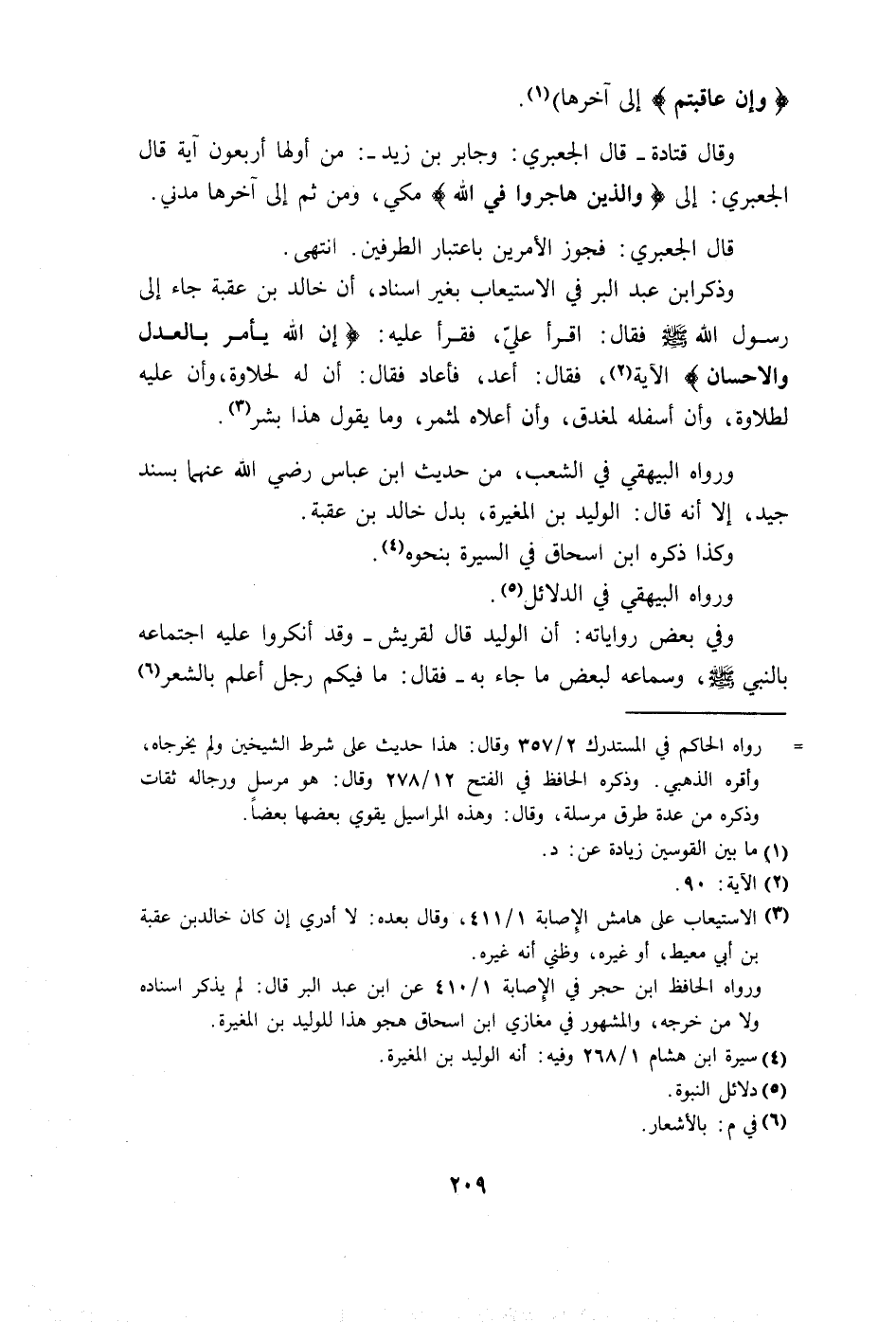 رسول الله - صلى الله عليه وسلم - فقال: اقرأ عليَّ، فقرأ عليه: (إِنَّ اللَّهَ يَأْمُرُ بِالْعَدْلِ وَالْإِحْسَانِ) الآية.