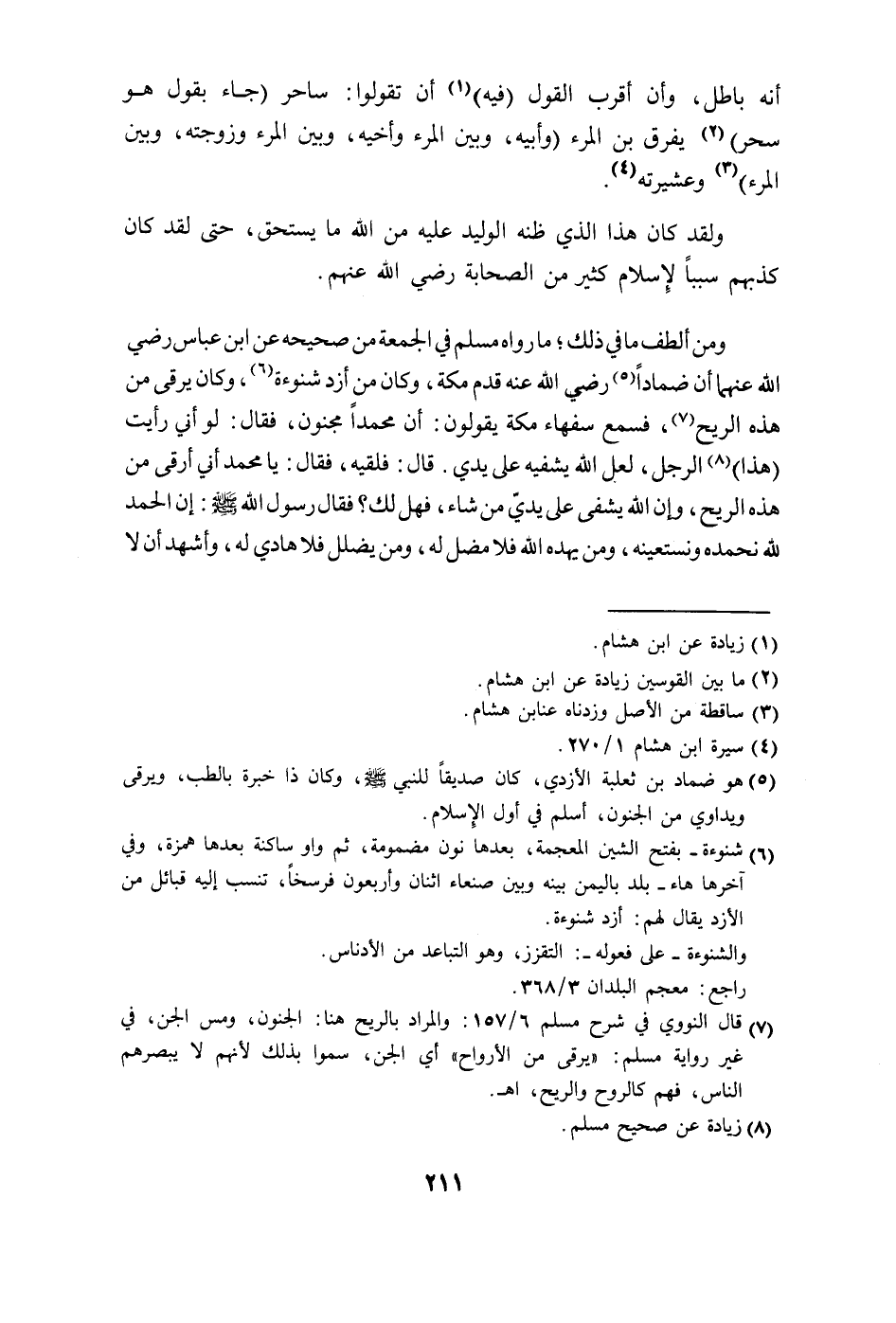 ومن ألطف ما في ذلك: ما رواه مسلم في الجمعة من صحيحه عن ابن عباس رضي الله عنهما أن ضماداً رضي الله عنه قدم مكة، وكان من أزد شنوءة، وكان يرقى من هذه الريح، فسمع سفهاء مكة يقولون: إن محمداً مجنون، فقال: لو أني رأيت هذا الرجل، لعل الله يشفيه على يدي.