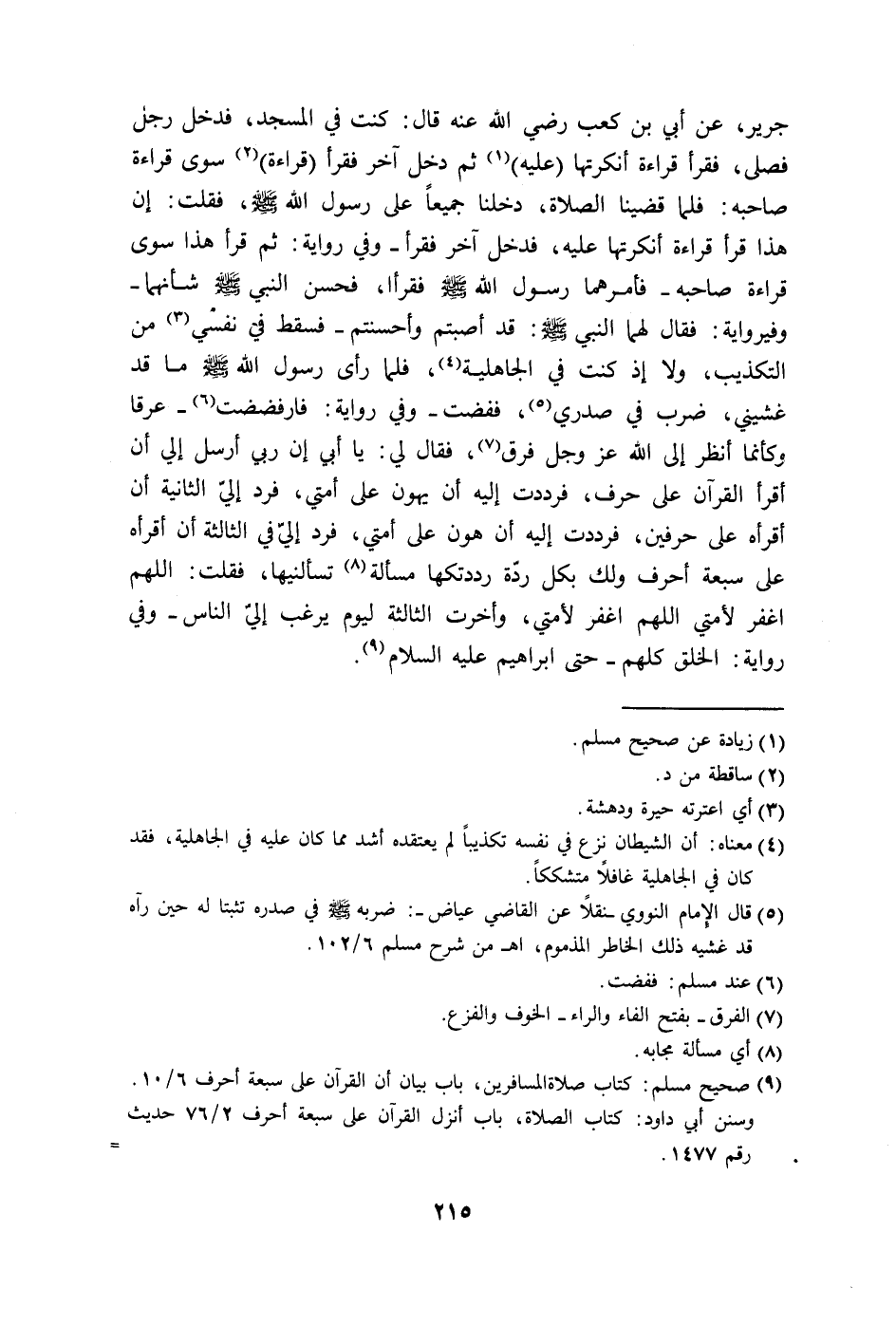 وفي رواية: فقال لهما النبي - صلى الله عليه وسلم -: قد أصبتم وأحسنتم - فسقط في نفسي من التكذيب، ولا إذ كنت في الجاهلية، فلما رأى رسول الله - صلى الله عليه وسلم - ما قد غشيني، ضرب في صدري، ففضت - وفي رواية: فارفضضت - عرقا فكأنما أنظر إلى الله عز وجل فرق، فقال لي: يا أبي إن ربي أرسل إلي أن أقرأ القرآن على حرف، فرددت إليه أن يهون على أمتي، فرد إلي الثانية أن أقرأه على حرفين، فزددت إليه أن هون على أمتي، فرد إليَّ في الثالثة أن أقرأه على سبعة أحرف ولك بكل ردّة رددتكها مسألة تسألنيها، فقلت: اللهم اغفر لأمتي اللهم اغفر لأمتي، وأخرت الثالثة ليوم يرغب إليَّ الناس -