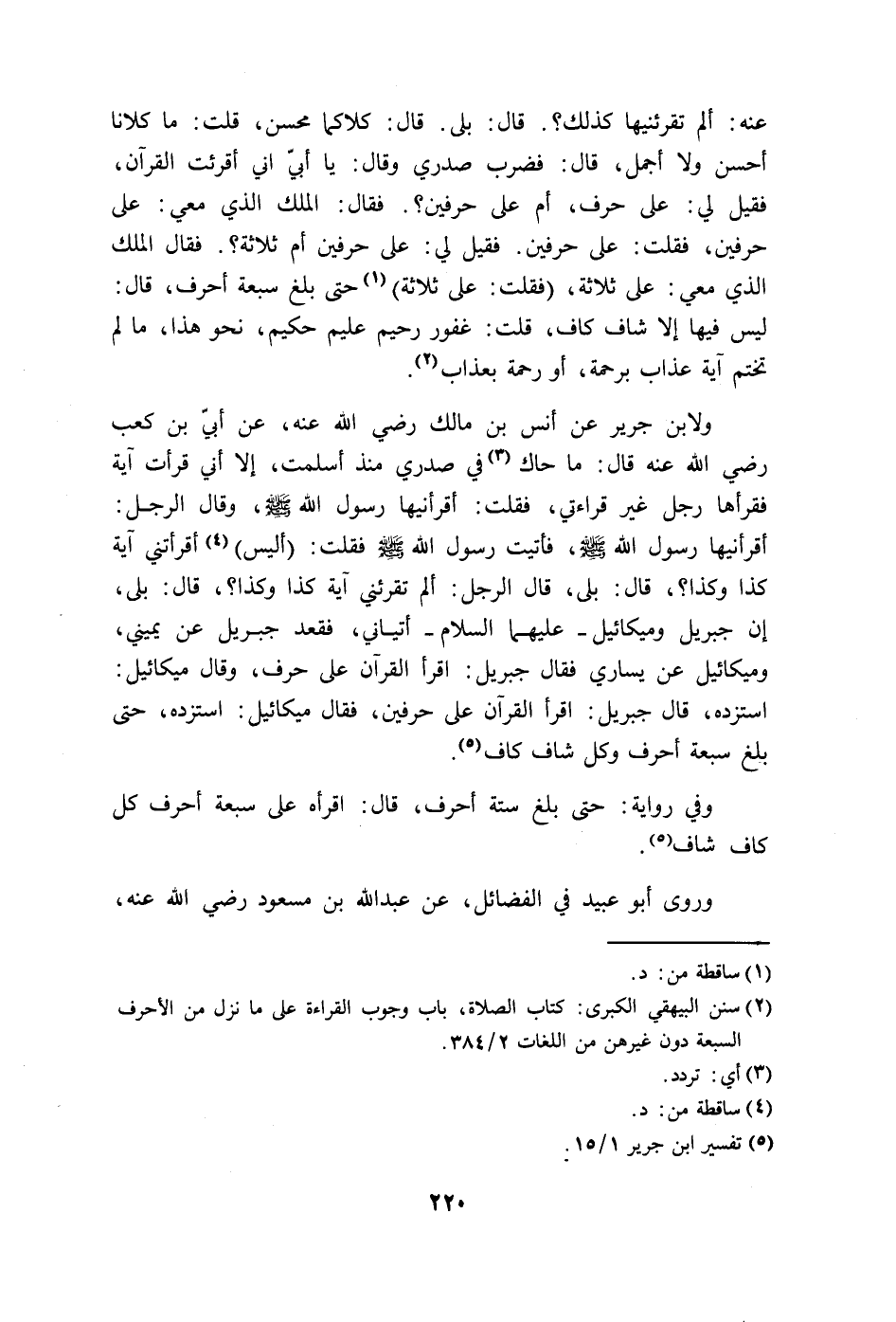 قال: بلى، إن جبريل وميكائيل - عليهما السلام - أتياني، فقعد جبريل عن يميني، وميكائيل عن يساري فقال جبريل: اقرأ القرآن على حرف، وقال ميكائيل: استزده، قال جبريل: اقرأ القرآن على حرفين، فقال ميكائيل: استزده، حتى بلغ سبعة أحرف وكل شاف كاف.
