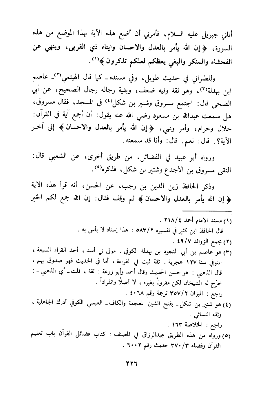 قال: أتاني جبريل عليه السلام، فأمرني أن أضع هذه الآية بهذا الوضع من هذه السورة، (إِنَّ اللَّهَ يَأْمُرُ بِالْعَدْلِ وَالْإِحْسَانِ وَإِيتَاءِ ذِي الْقُرْبَى وَيَنْهَى عَنِ الْفَحْشَاءِ وَالْمُنْكَرِ وَالْبَغْيِ يَعِظُكُمْ لَعَلَّكُمْ تَذَكَّرُونَ (90) .