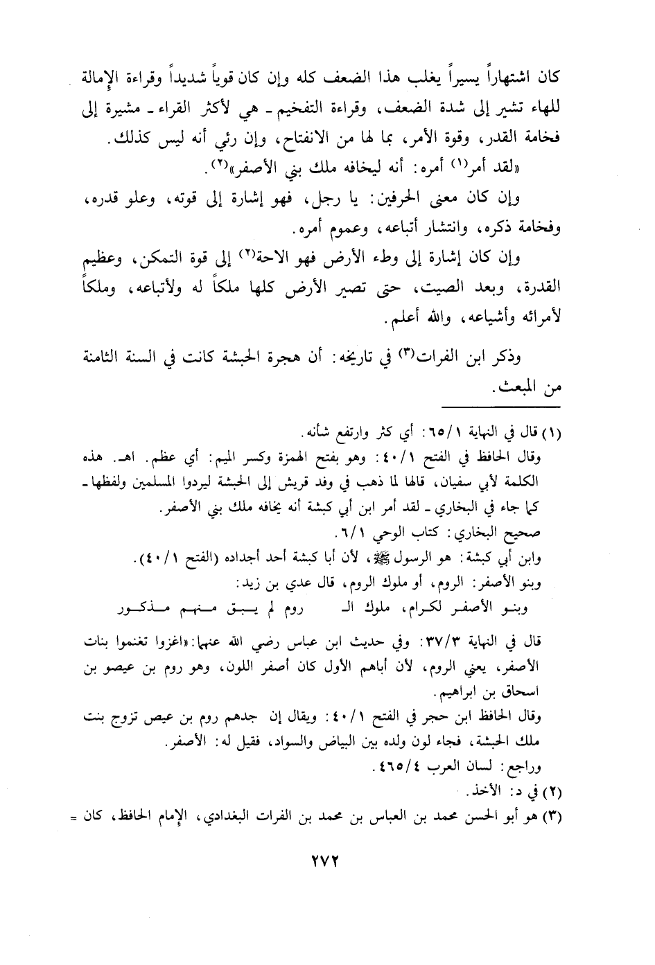كان اشتهاراً يسيراً يغلب هذا الضعف كله وإن كان قوياً شديداً وقراءة الِإمالة للهاء تشير إلى شدة الضعف، وقراءة التفخيم - هي لأكثر القراء - مشيرة إلى فخامة القدر، وقوة الأمر، بما لها من الانفتاح، وإن رئي أنه ليس كذلك.