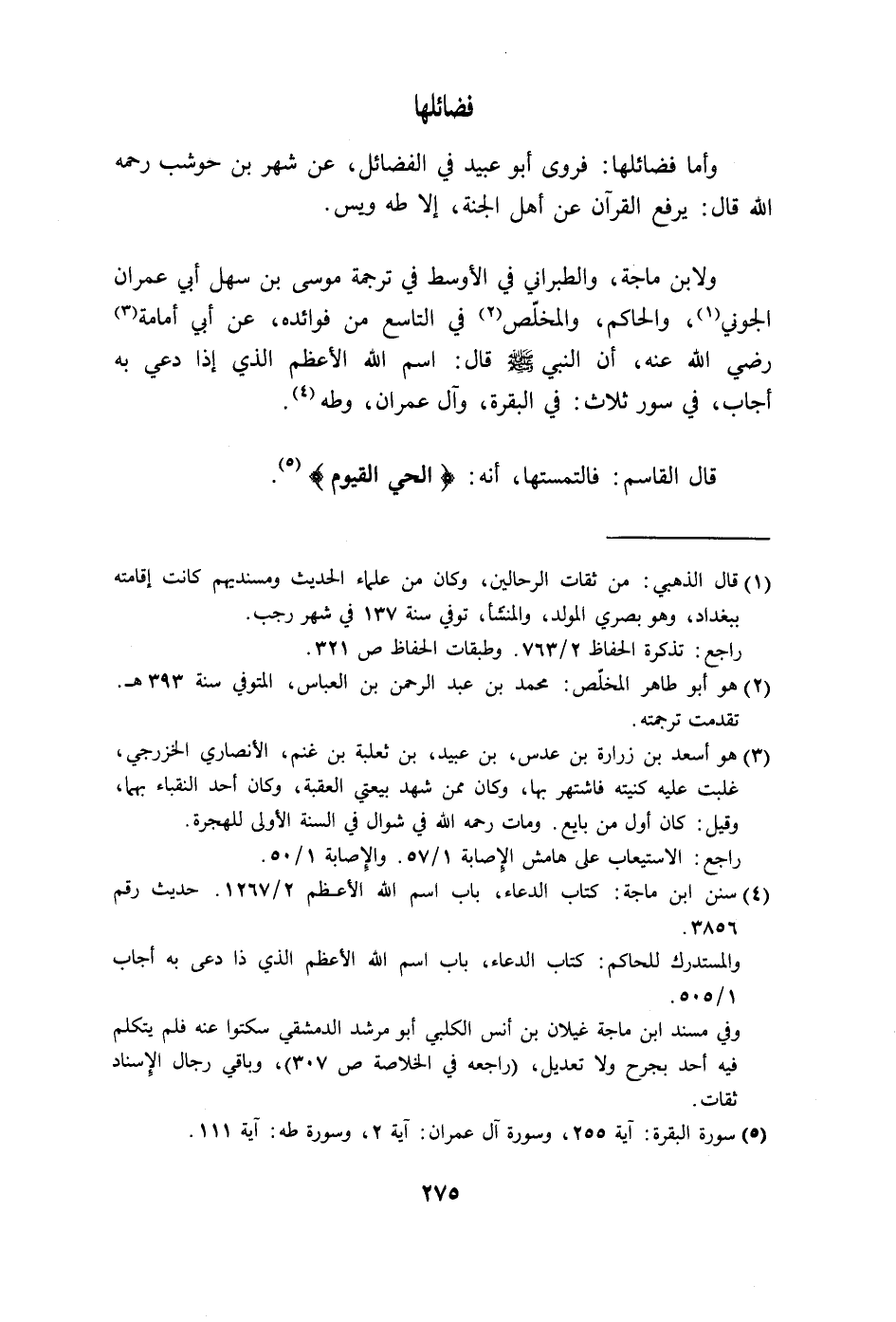 رضي الله عنه، أن النبي - صلى الله عليه وسلم - قال: اسم الله الأعظم الذي إذا دعي به أجاب، في سور ثلاث: في البقرة، وآل عمران، وطه.