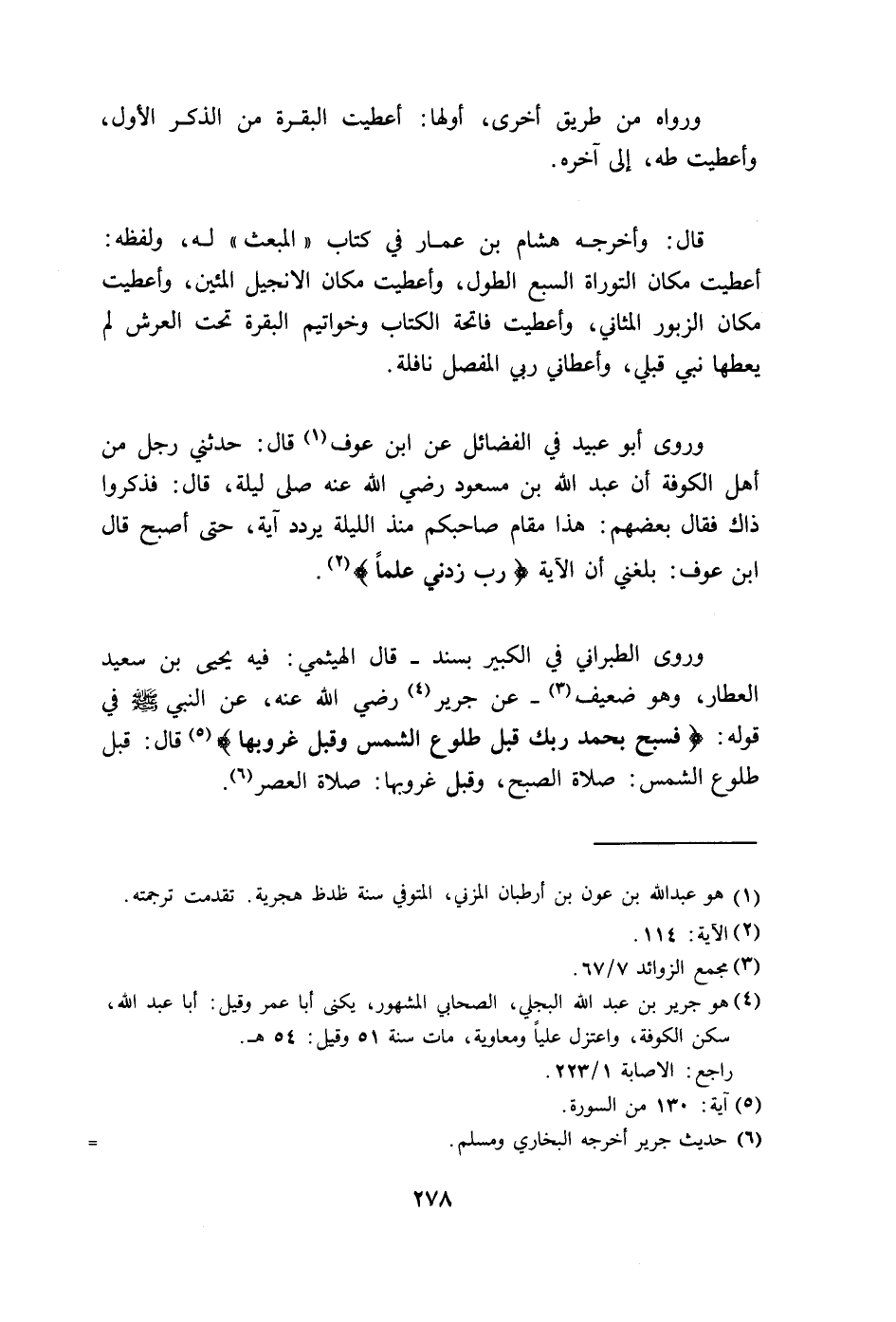 العطار، وهو ضعيف - عن جرير رضي الله عنه، عن النبي - صلى الله عليه وسلم - في قوله: (وَسَبِّحْ بِحَمْدِ رَبِّكَ قَبْلَ طُلُوعِ الشَّمْسِ وَقَبْلَ غُرُوبِهَا) قال: قبل طلوع الشمس: صلاة الصبح، وقبل غروبها: صلاة العصر.