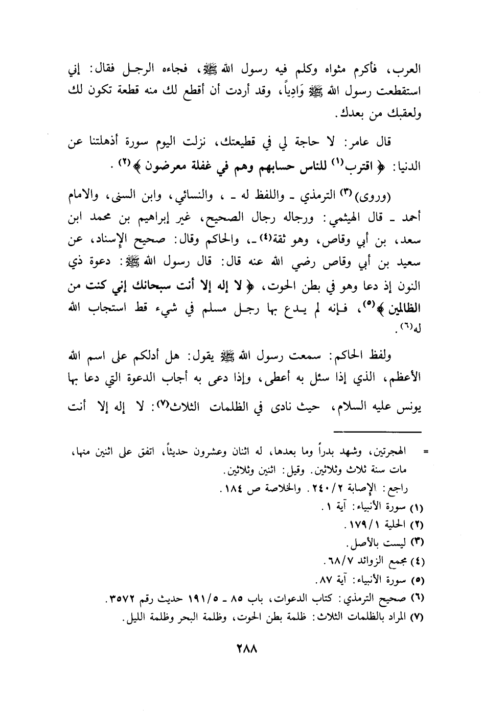 ولفظ الحاكم: سمعت رسول الله - صلى الله عليه وسلم - يقول: هل أدلكم على اسم الله الأعظم، الذي إذا سئل به أعطى، وإذا دعى به أجاب الدعوة التي دعا بها يونس عليه السلام، حيث نادى في الظلمات الثلاث: