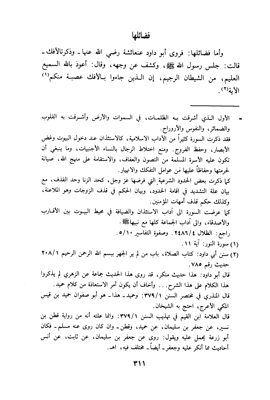وأما فضائلها: فروى أبو داود عن عائشة رضي الله عنها - وذكرت الإفك - قالت: جلس رسول الله - صلى الله عليه وسلم -، وكشف عن وجهه، وقال: أعوذ بالله السميع العليم، من الشيطان الرجيم، (إِنَّ الَّذِينَ جَاءُوا بِالْإِفْكِ عُصْبَةٌ مِنْكُمْ) الآية.