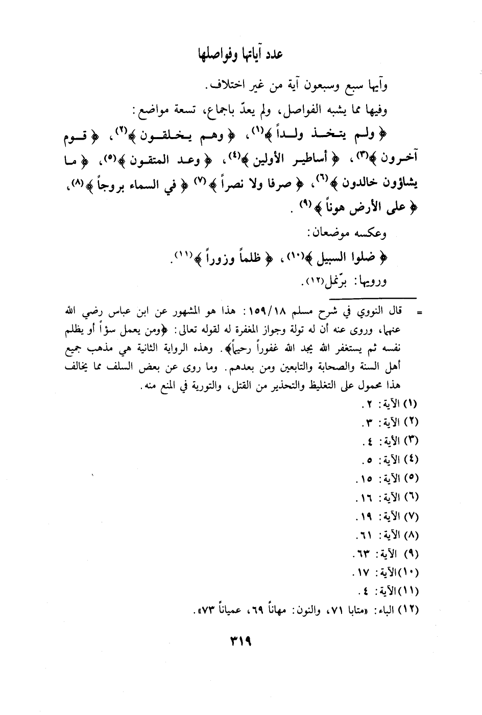 (وُعِدَ الْمُتَّقُونَ) ، (مَا يَشَاءُونَ خَالِدِينَ) ، (صَرْفًا وَلَا نَصْرًا) (فِي السَّمَاءِ بُرُوجًا) ، (عَلَى الْأَرْضِ هَوْنًا) .