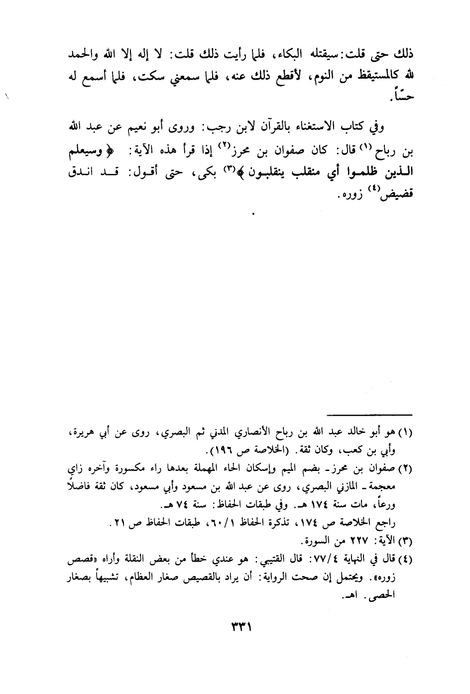 بن رباح قال: كان صفوان بن محرز إذا قرأ هذه الآية: (وَسَيَعْلَمُ الَّذِينَ ظَلَمُوا أَيَّ مُنْقَلَبٍ يَنْقَلِبُونَ) بكى، حتى أقول: قد اندق
