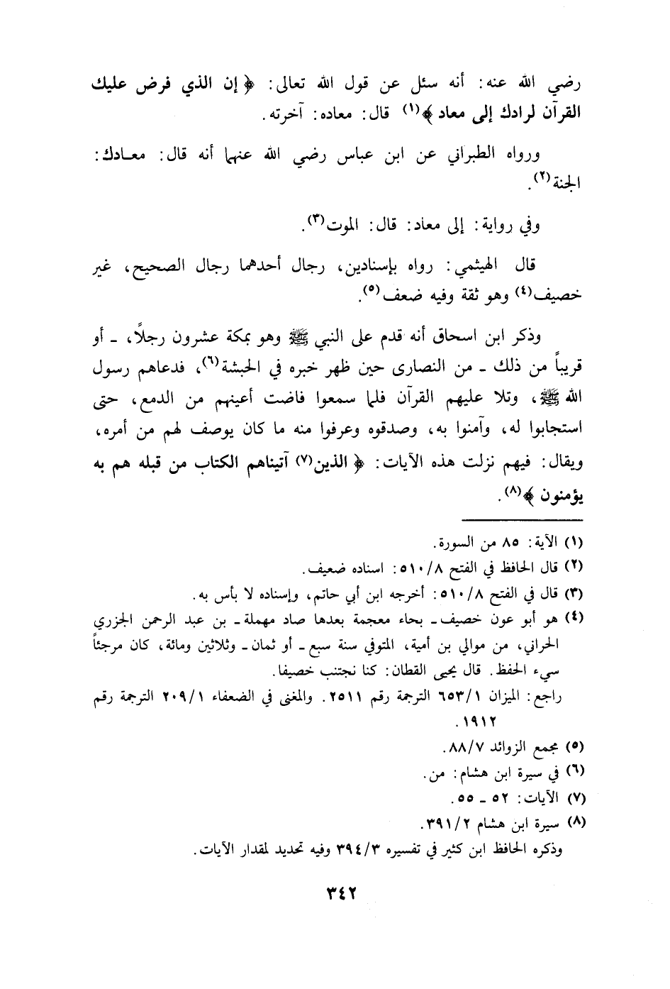 رضي الله عنه: أنه سئل عن قول الله تعالى: (إِنَّ الَّذِي فَرَضَ عَلَيْكَ الْقُرْآنَ لَرَادُّكَ إِلَى مَعَادٍ) قال: معاده: آخرته.
