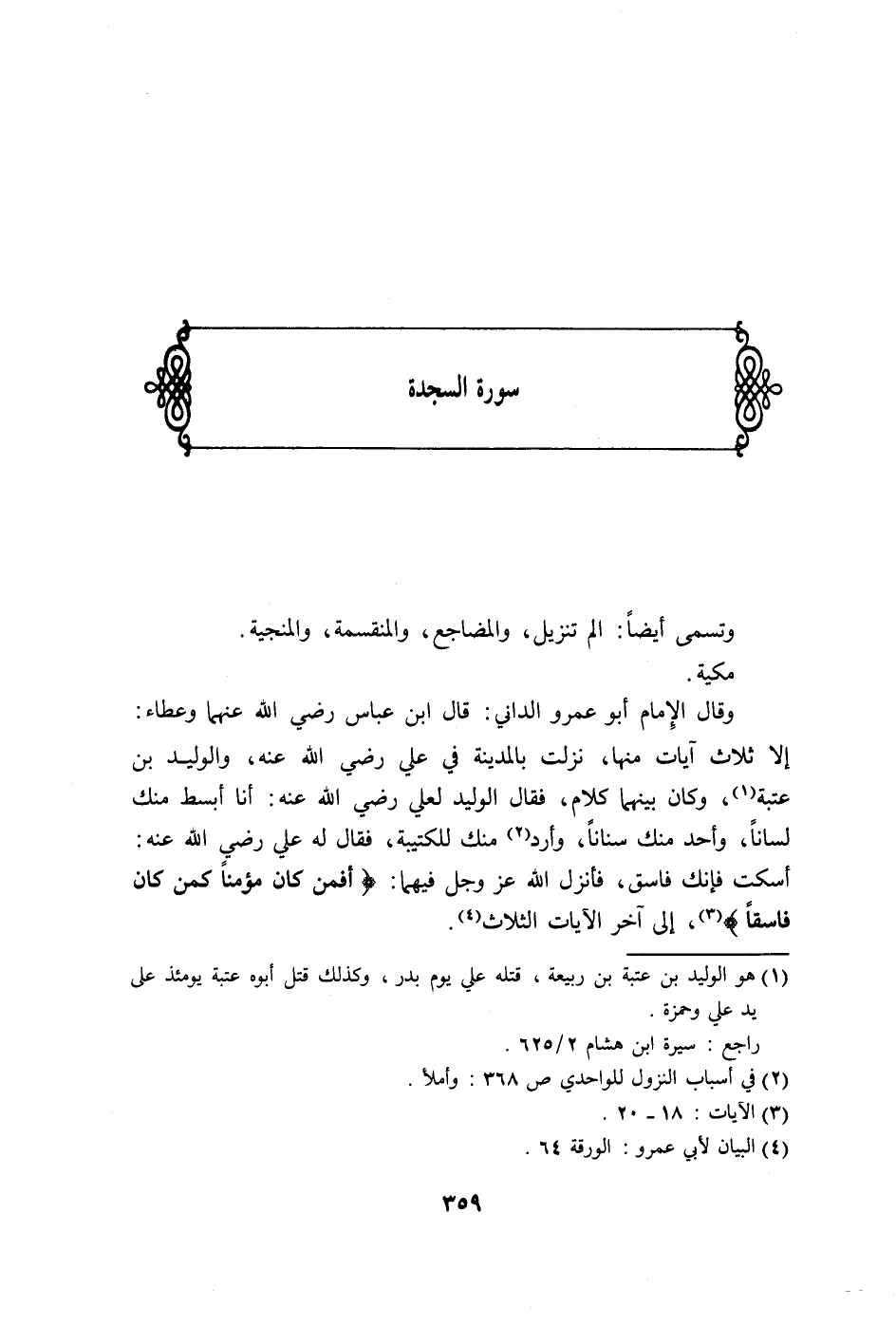 أسكت فإنك فاسق، فأنزل الله عز وجل فيهما: (أَفَمَنْ كَانَ مُؤْمِنًا كَمَنْ كَانَ فَاسِقًا) ، إلى آخر الآيات الثلاث.