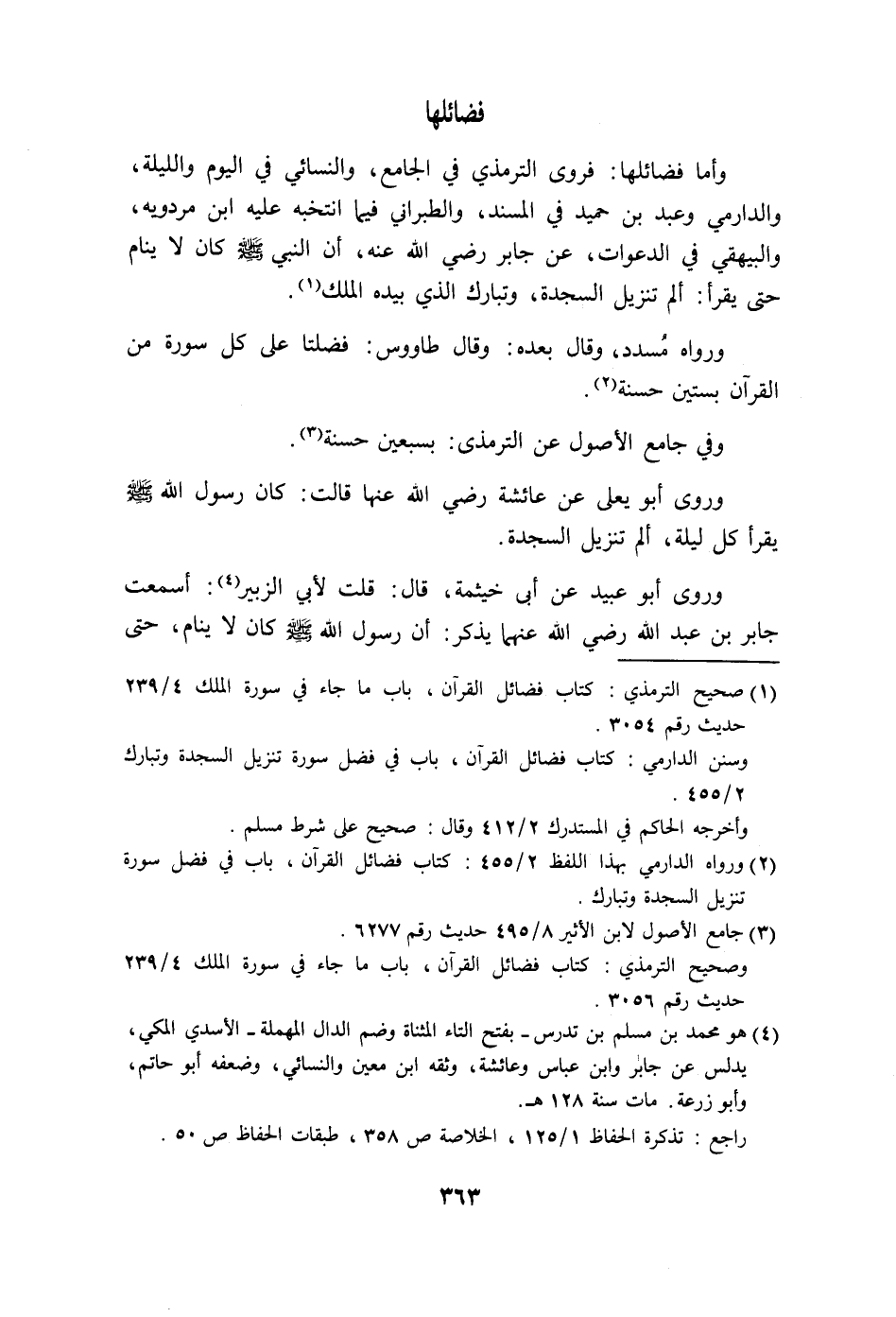 والبيهقي في الدعوات، عن جابر رضي الله عنه، أن النبي - صلى الله عليه وسلم - كان لا ينام حتى يقرأ: الم تنزيل السجدة، وتبارك الذي بيده الملك.