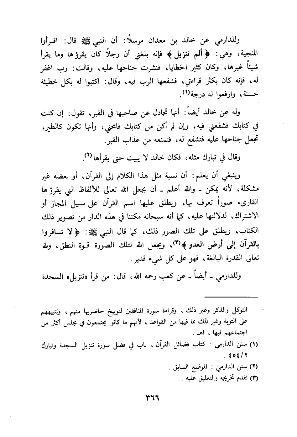 وللدارمي عن خالد بن معدان مرسلاً: أن النبي - صلى الله عليه وسلم - قال: اقرأوا المنجية، وهي: (الم تنزيل) فإنه بلغني أن رجلا كان يقرؤها وما يقرأ شيئاً غيرها، وكان كثير الخطايا، فنشرت جناحها عليه، وقالت: رب اغفر له، فإنه كان يكثر قراءتي، فشفعها الرب فيه، وقال: اكتبوا له بكل خطيئة حسنة، وارفعوا له درجة.