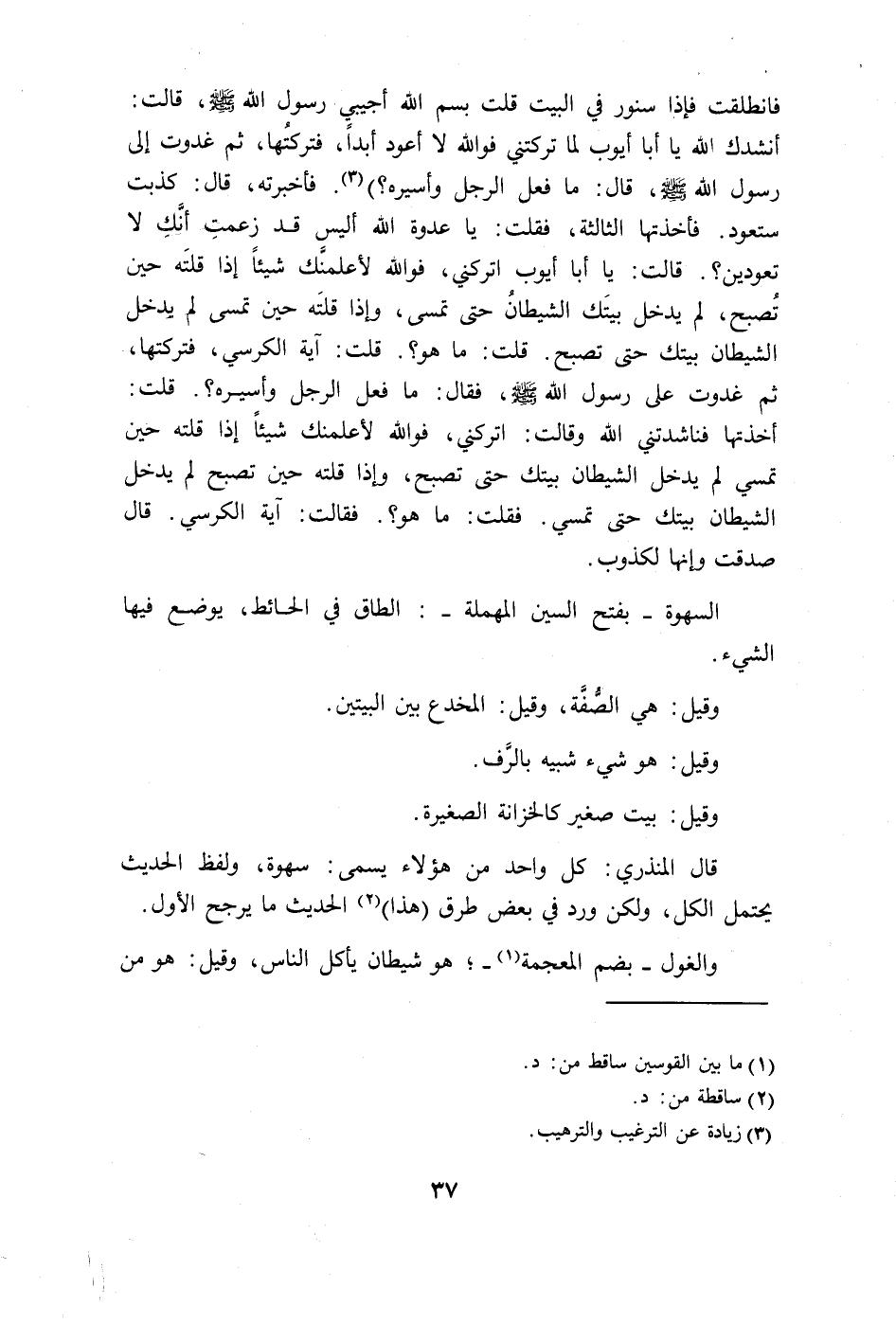 فانطلقت فإذا سنور في البيت قلت بسم الله أجيبي رسول الله - صلى الله عليه وسلم -، قالت: أنشدك الله يا أبا أيوب لما تركتني فوالله لا أعود أبداَ، فتركتها، ثم غدوت إلى رسول الله - صلى الله عليه وسلم -، قال: ما فعل الرجل وأسيره؟.