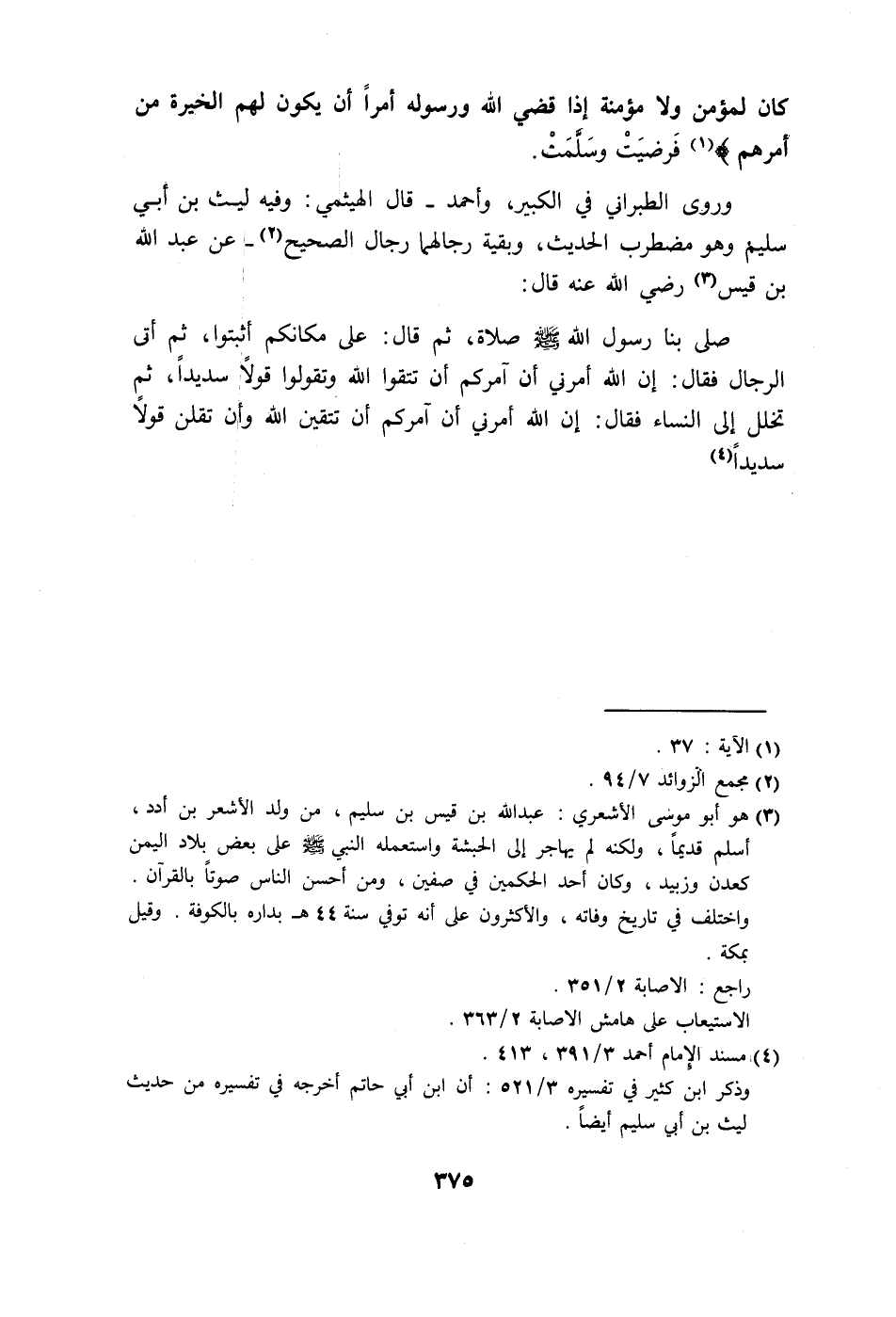 بن قيس رضي الله عنه قال: صلى بنا رسول الله - صلى الله عليه وسلم -صلاة، ثم قال: على مكانكم أثبتوا، ثم أتى الرجال فقال: إن الله أمرني أن آمركم أن تتقوا الله وتقولوا قولاً سديداً، ثم تخلل إلى النساء فقال: إن الله أمرني أن آمركم أن تتقين الله وأن تقلن قولَا سديداً.