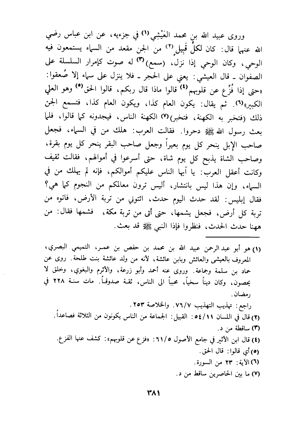 بعث رسول الله - صلى الله عليه وسلم - دحروا. فقالت العرب: هلك من في السماء، فجعل صاحب الإِبل ينحر كل يوم بعيراً وجعل صاحب البقر ينحر كل يوم بقرة، وصاحب الشاة يذبح كل يوم شاة، حتى أسرعوا في أموالهم، فقالت ثقيف وكانت أعقل العرب: يا آيها الناس عليكم أموالكم، فإنه لم يهلك من في السماء، وإن هذا ليس بانتشار، أليس ترون معالمكم من النجوم كما هي؟