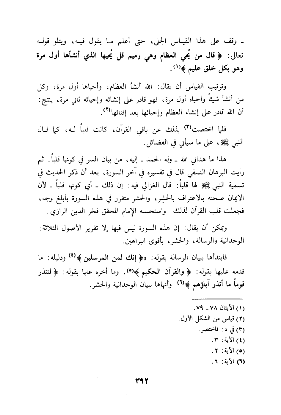 ثم رأيت البرهان النسفي قال في تفسيره في آخر السورة، بعد أن ذكر الحديث في تسمية النبي - صلى الله عليه وسلم - لها قلباً: قال الغزالي فيه: إن ذلك - أي كونها قلباً - لأن الإيمان صحته بالاعتراف بالحشر، والحشر متقرر في هذه السورة بأبلغ وجه، فجعلت قلب القرآن لذلك.