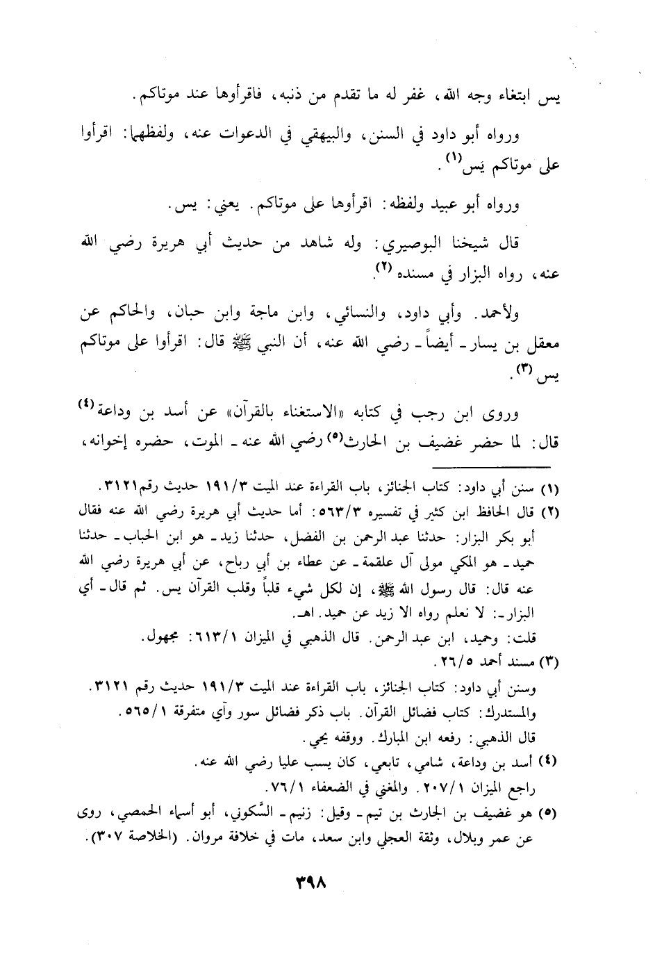 معقل بن يسار - أيضاً - رضي الله عنه، أن النبي - صلى الله عليه وسلم - قال: اقرأوا على موتاكم يس.