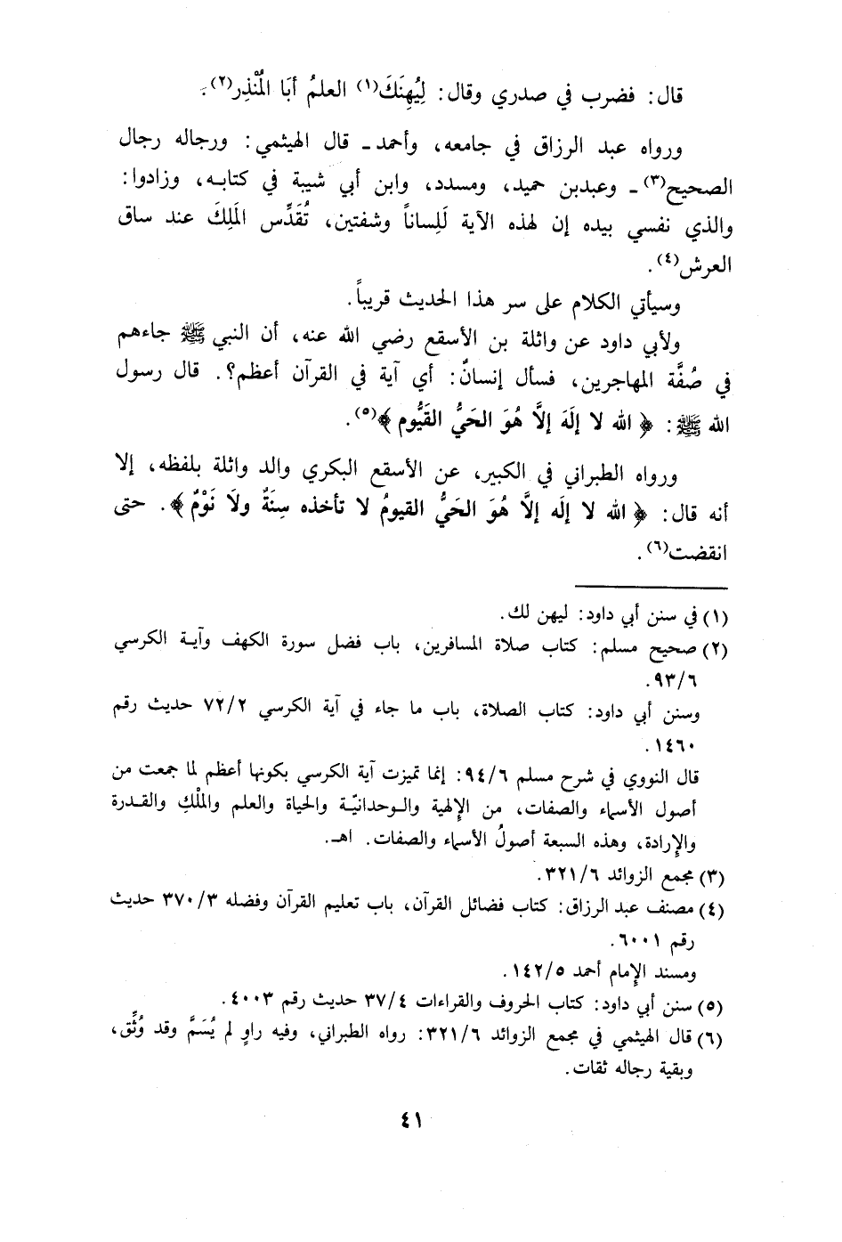 ولأبي داود عن واثلة بن الأسقع رضي الله عنه، أن النبي - صلى الله عليه وسلم - جاءهم في صُفَة المهاجرين، فسأل إنسانٌ: أي آية في القرآن أعظم؟. قال رسول الله - صلى الله عليه وسلم -: (اللَّهُ لَا إِلَهَ إِلَّا هُوَ الْحَيُّ الْقَيُّومُ) .