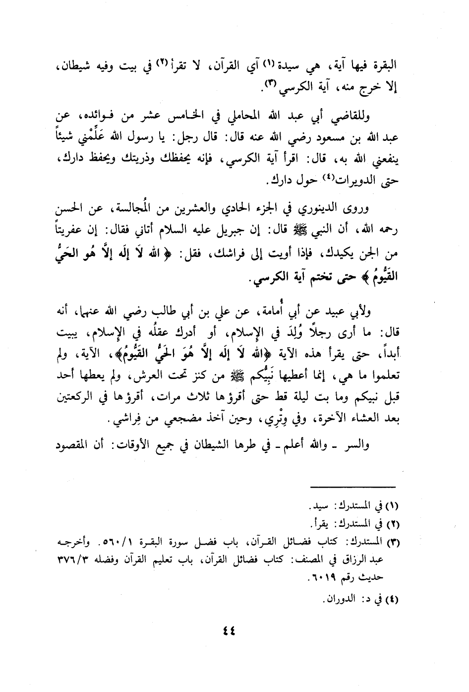 رحمه الله، أن النبي - صلى الله عليه وسلم - قال: إِن جبريل عليه السلام أتاني فقال: إن عفريتاً من الجن يكيدك، فإذا أويت إِلى فراشك، فقل: (الله اللَّهُ لَا إِلَهَ إِلَّا هُوَ الْحَيُّ الْقَيُّومُ) حتى تختم آية الكرسي.